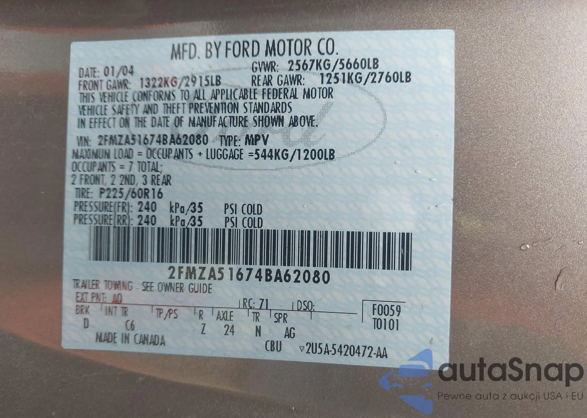 VIN: 2FMZA51674BA62080