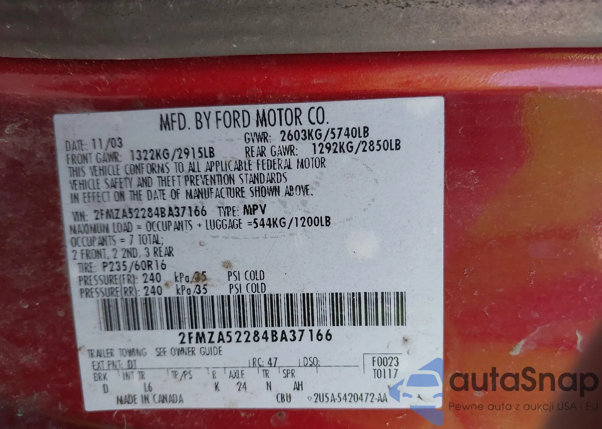 Samochód Ford Freestar 2004 (VIN 2FMZA52284BA37166) sprzedaje go niezweryfikowany sprzedawca. Zalecamy raport Carfax i potwierdzenie możliwości rejestracji pojazdu przed zakupem.