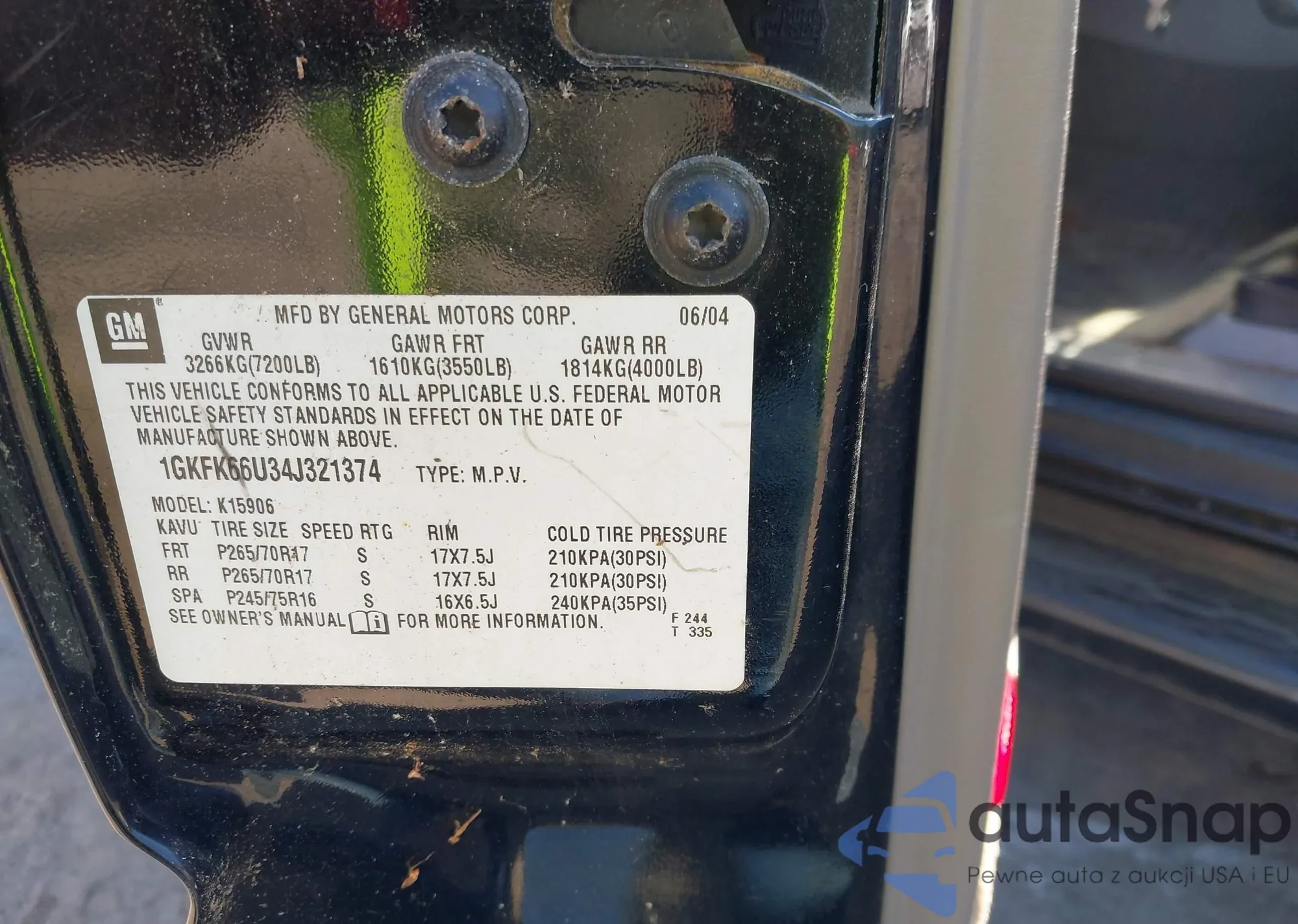 Samochód GMC Yukon 2004 (VIN 1GKFK66U34J321374) ma dokumenty uniemożliwiające rejestrację. Mogą pojawić się trudności przy eksporcie i rejestracji. Skontaktuj się z ekspertami AutaSnap w celu znalezienia alternatywy.