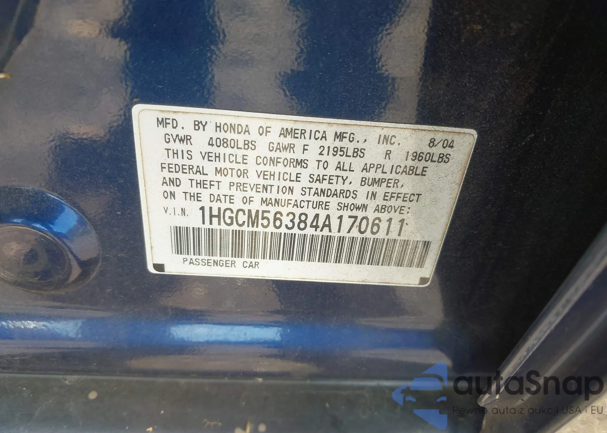 Samochód Honda Accord 2004 (VIN 1HGCM56384A170611) nie był wcześniej licytowany. Dokumenty są czyste, przebieg odpowiada lub jest niższy niż średnia rynku. Sprzedaje go firma ubezpieczeniowa – polecamy zakup. Dostawa do portu zajmie ok. 6–8 tygodni.