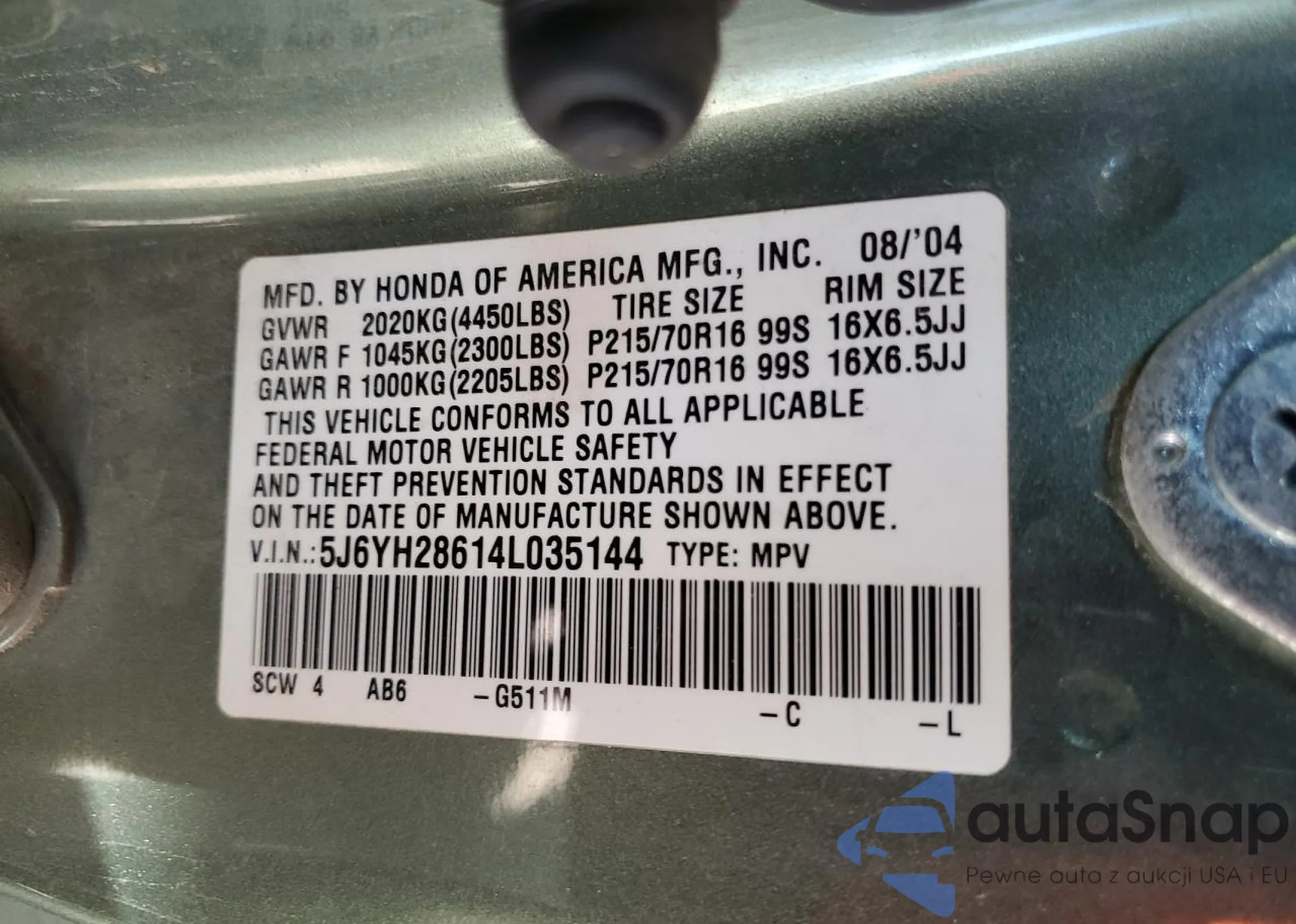 VIN: 5J6YH28614L035144