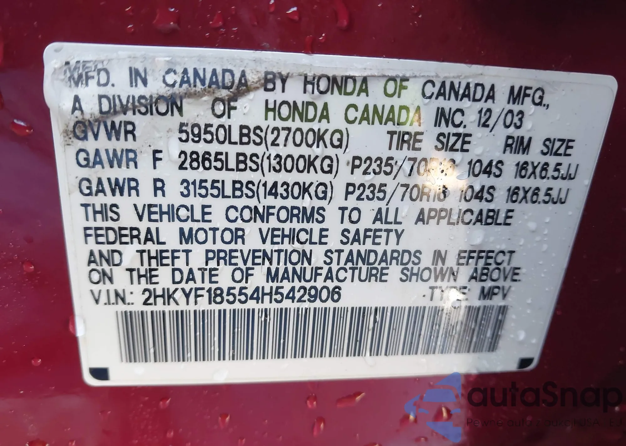 VIN: 2HKYF18554H542906