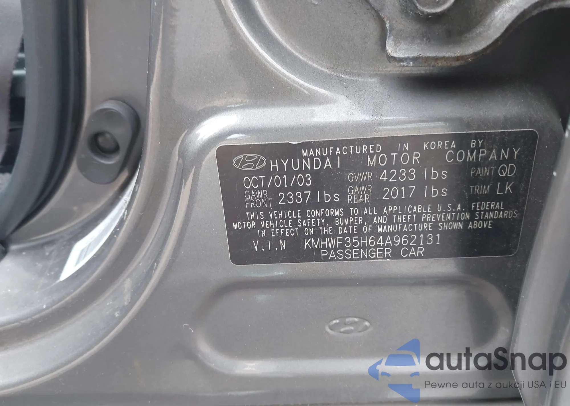 Samochód Hyundai Sonata 2004 (VIN KMHWF35H64A962131) nie był wcześniej licytowany. Dokumenty są czyste, przebieg odpowiada lub jest niższy niż średnia rynku. Sprzedaje go firma ubezpieczeniowa – polecamy zakup. Dostawa do portu zajmie ok. 6–8 tygodni.