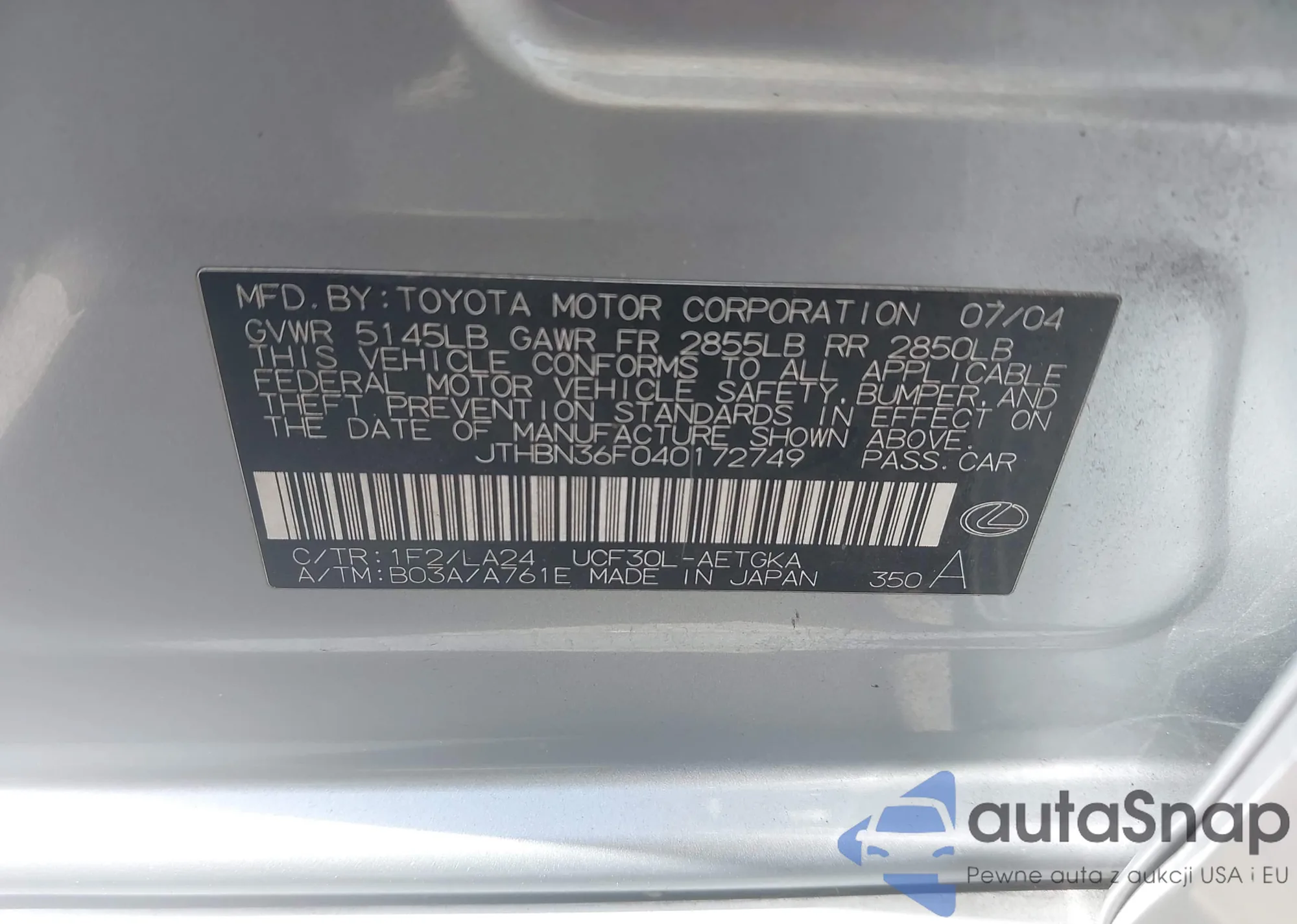 VIN: JTHBN36F040172749
