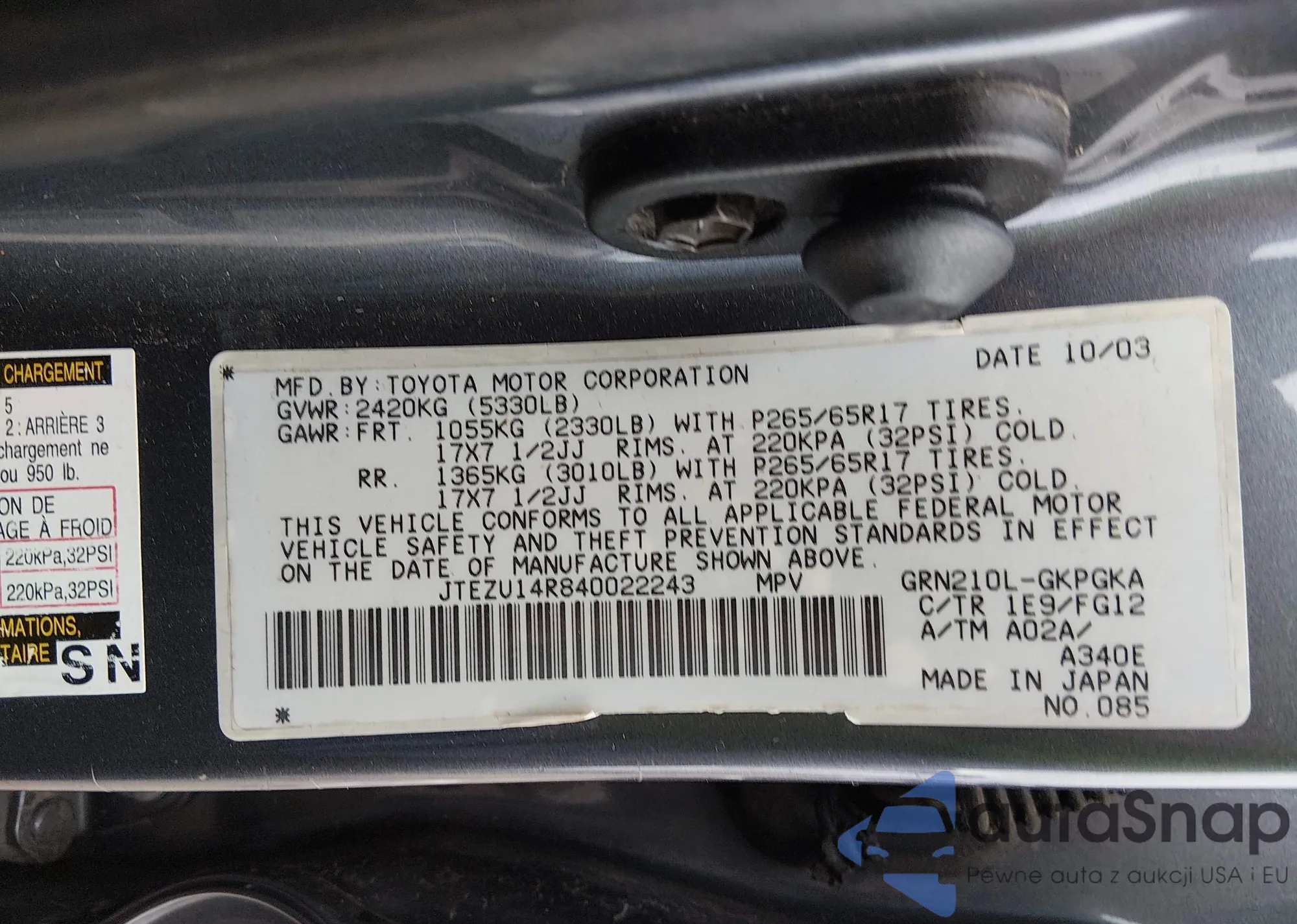 Samochód Toyota 4Runner 2004 (VIN JTEZU14R840022243) nie był wcześniej licytowany. Dokumenty są czyste, przebieg odpowiada lub jest niższy niż średnia rynku. Sprzedaje go firma ubezpieczeniowa – polecamy zakup. Dostawa do portu zajmie ok. 6–8 tygodni.