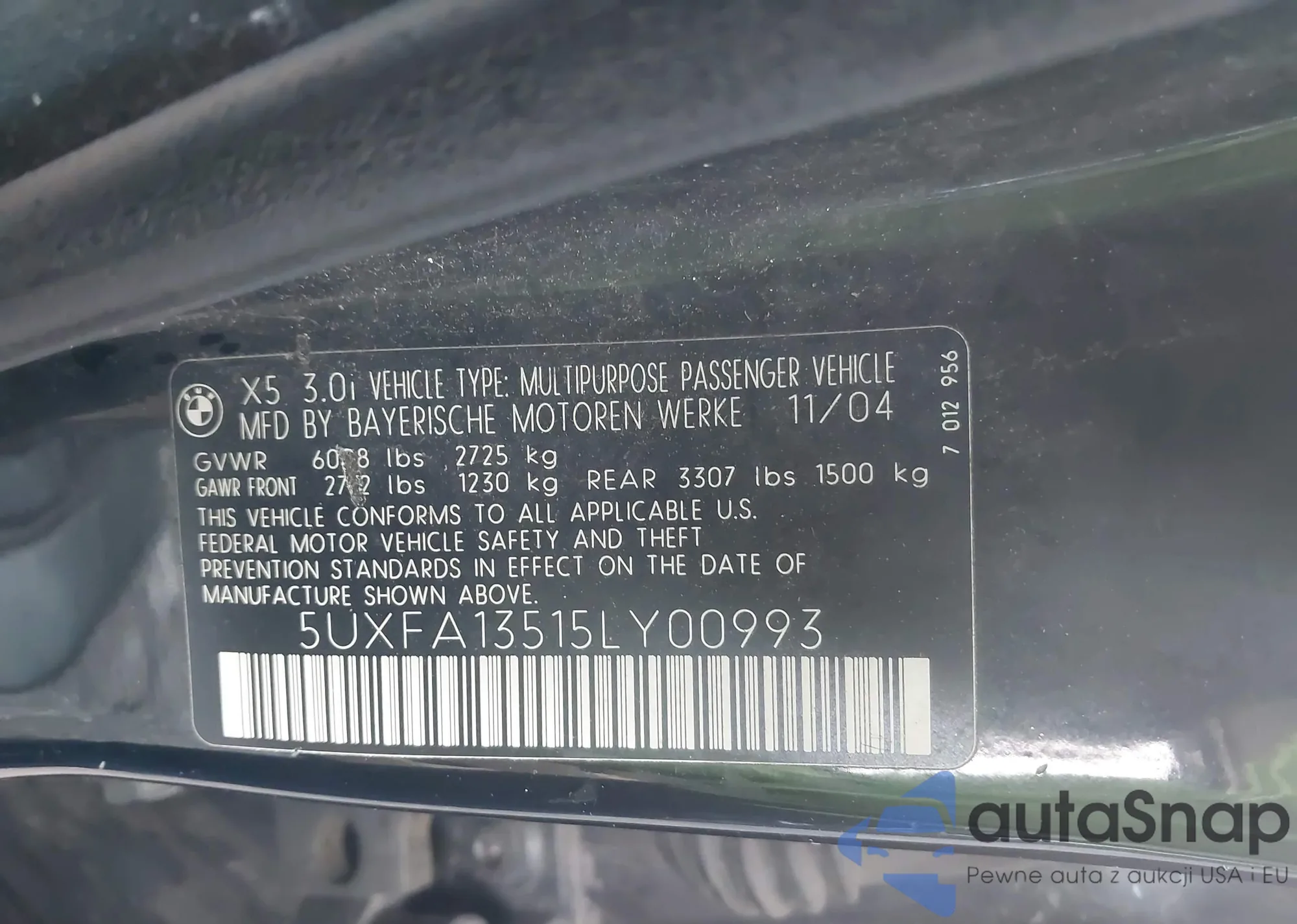Samochód BMW X5 2005 (VIN 5UXFA13515LY00993) nie był wcześniej licytowany. Dokumenty są czyste, przebieg odpowiada lub jest niższy niż średnia rynku. Sprzedaje go firma ubezpieczeniowa – polecamy zakup. Dostawa do portu zajmie ok. 6–8 tygodni.