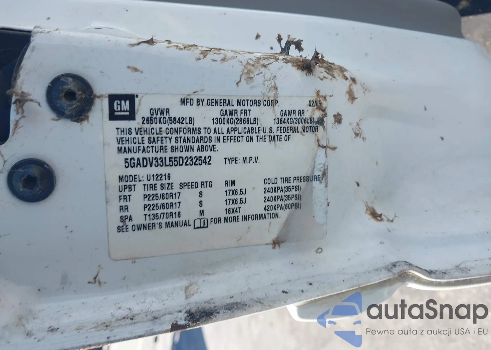 Samochód Buick Terraza 2005 (VIN 5GADV33L55D232542) sprzedaje go niezweryfikowany sprzedawca. Zalecamy raport Carfax i potwierdzenie możliwości rejestracji pojazdu przed zakupem.