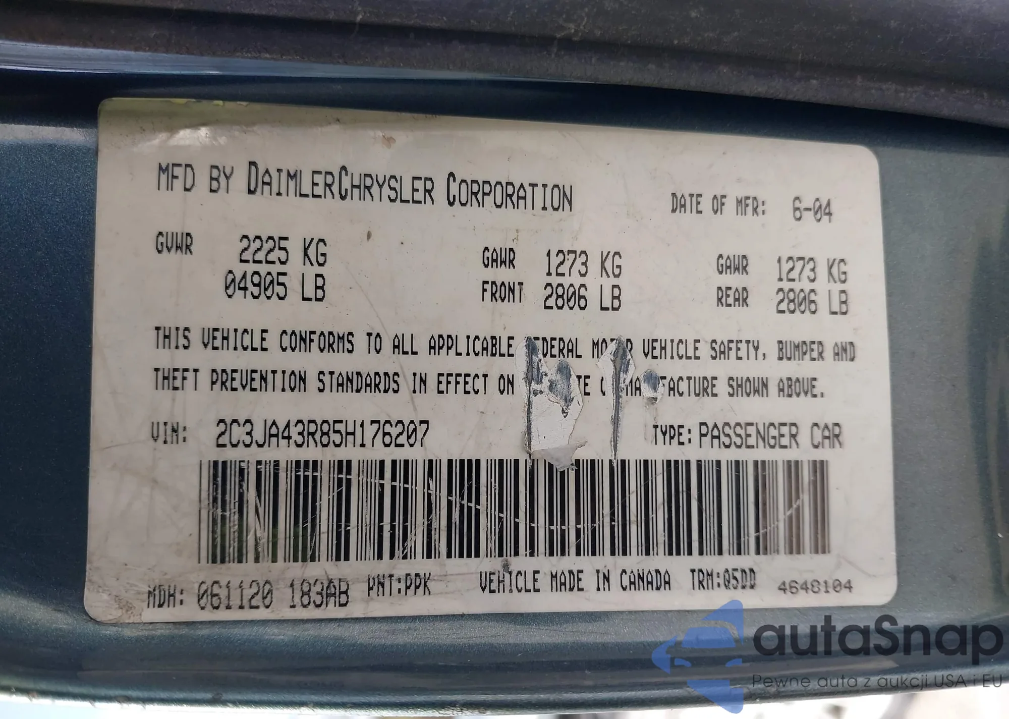 Samochód Chrysler 300 2005 (VIN 2C3JA43R85H176207) nie był wcześniej licytowany. Dokumenty są czyste, przebieg odpowiada lub jest niższy niż średnia rynku. Sprzedaje go firma ubezpieczeniowa – polecamy zakup. Dostawa do portu zajmie ok. 6–8 tygodni.