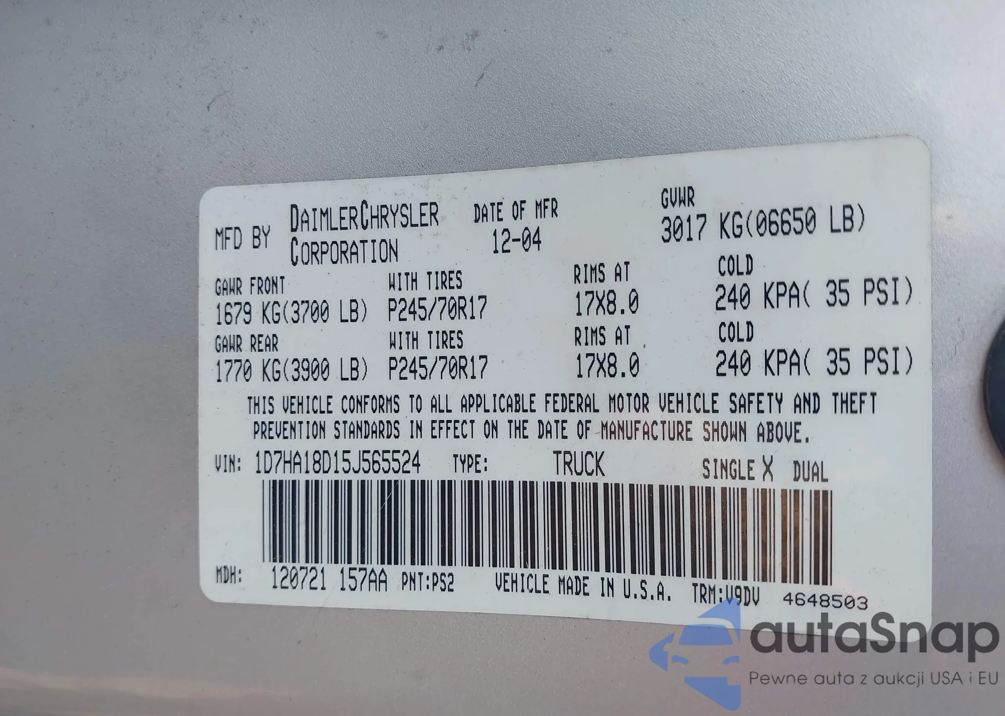 Samochód Dodge RAM 2005 (VIN 1D7HA18D15J565524) sprzedaje go niezweryfikowany sprzedawca. Zalecamy raport Carfax i potwierdzenie możliwości rejestracji pojazdu przed zakupem.