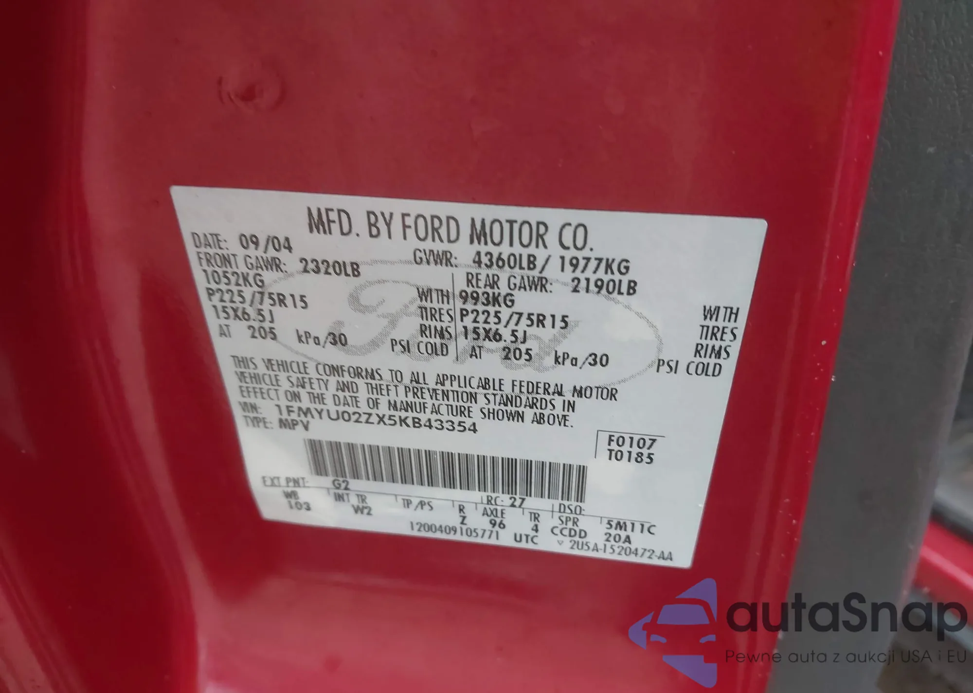 Samochód Ford Escape 2005 (VIN 1FMYU02ZX5KB43354) był już licytowany 1 razy i/lub sprzedaje go niezweryfikowany sprzedawca. Zalecamy raport Carfax i potwierdzenie możliwości rejestracji pojazdu przed zakupem.