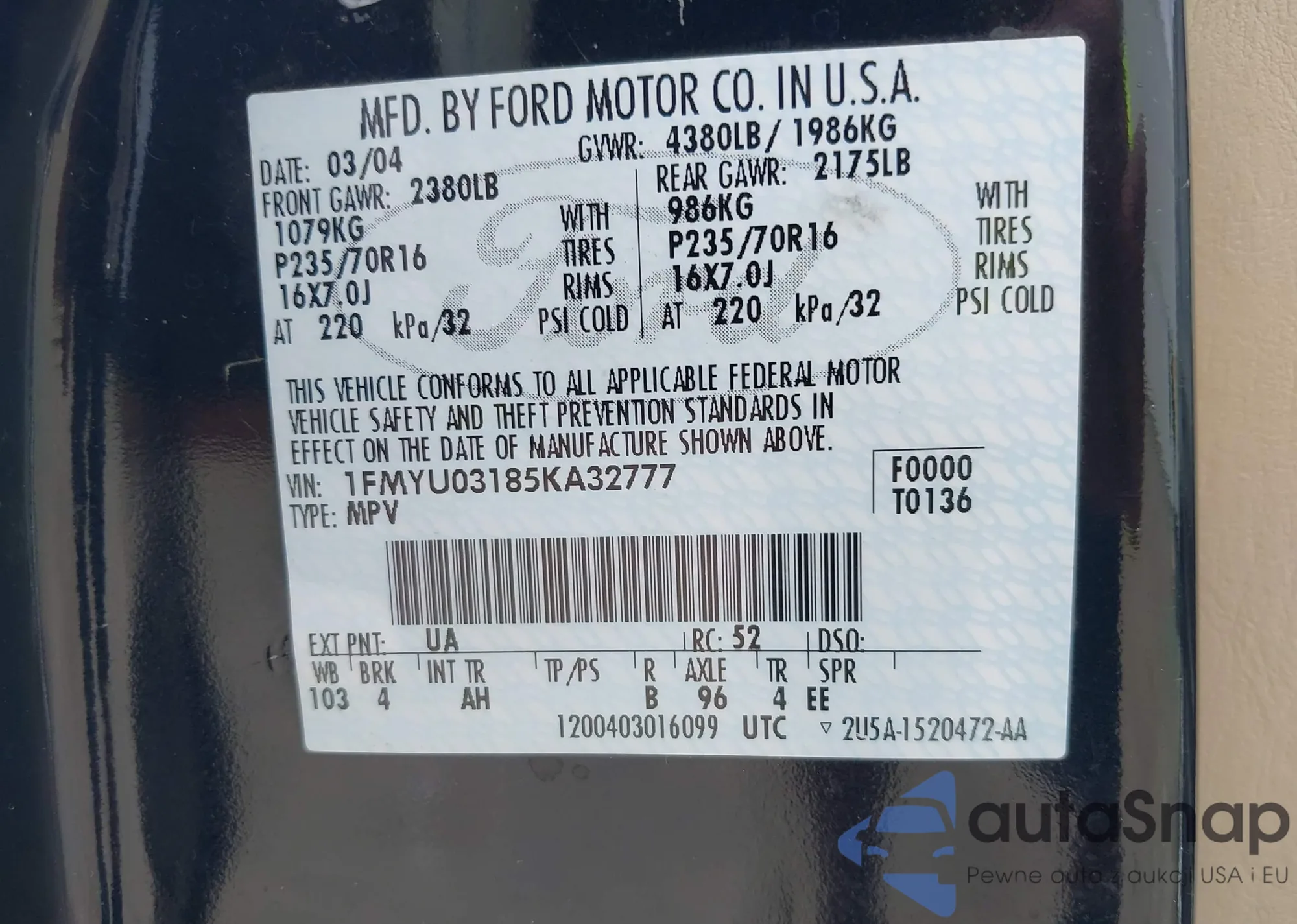 VIN: 1FMYU03185KA32777