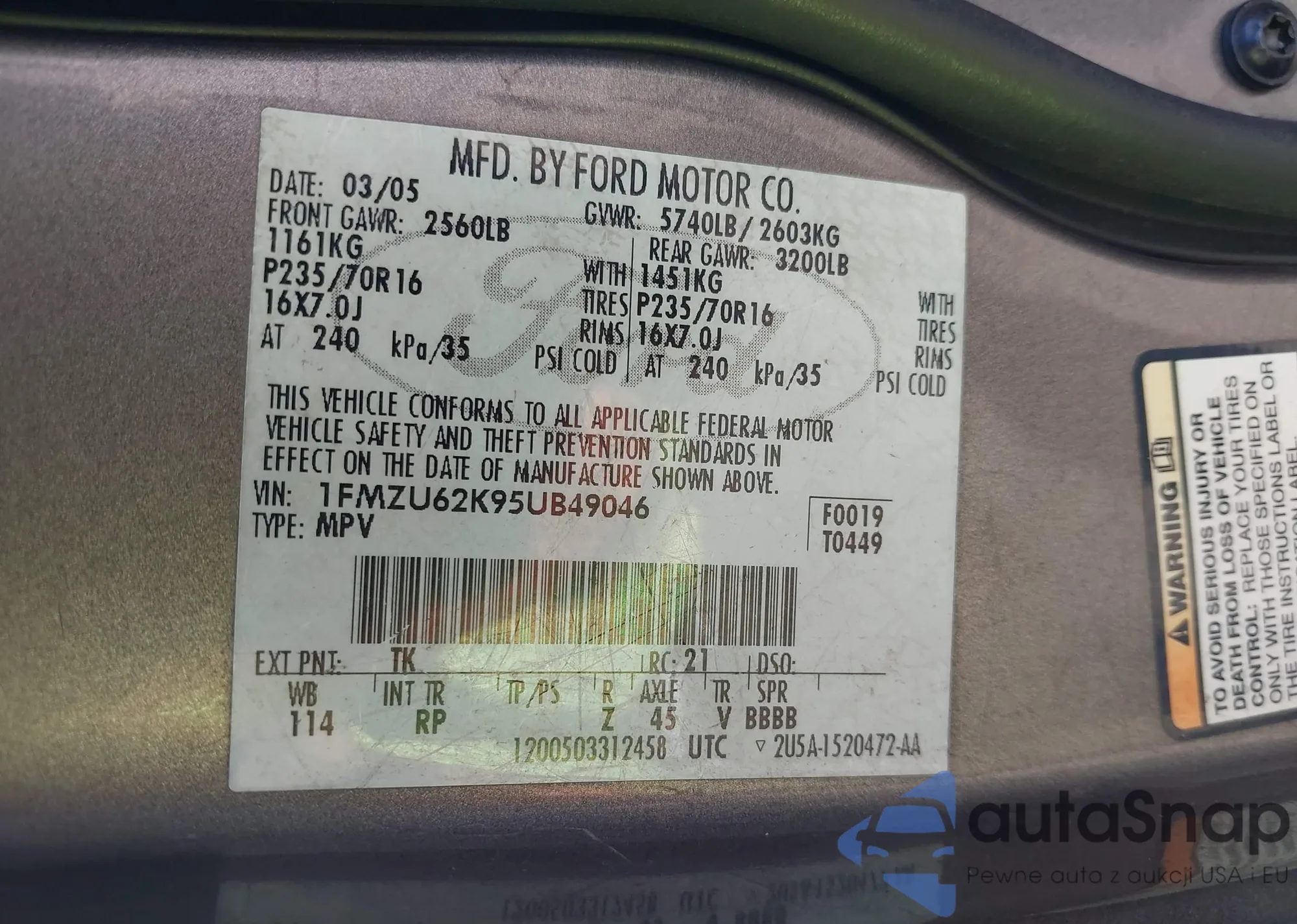 • VIN: 1FMZU62K95UB49046