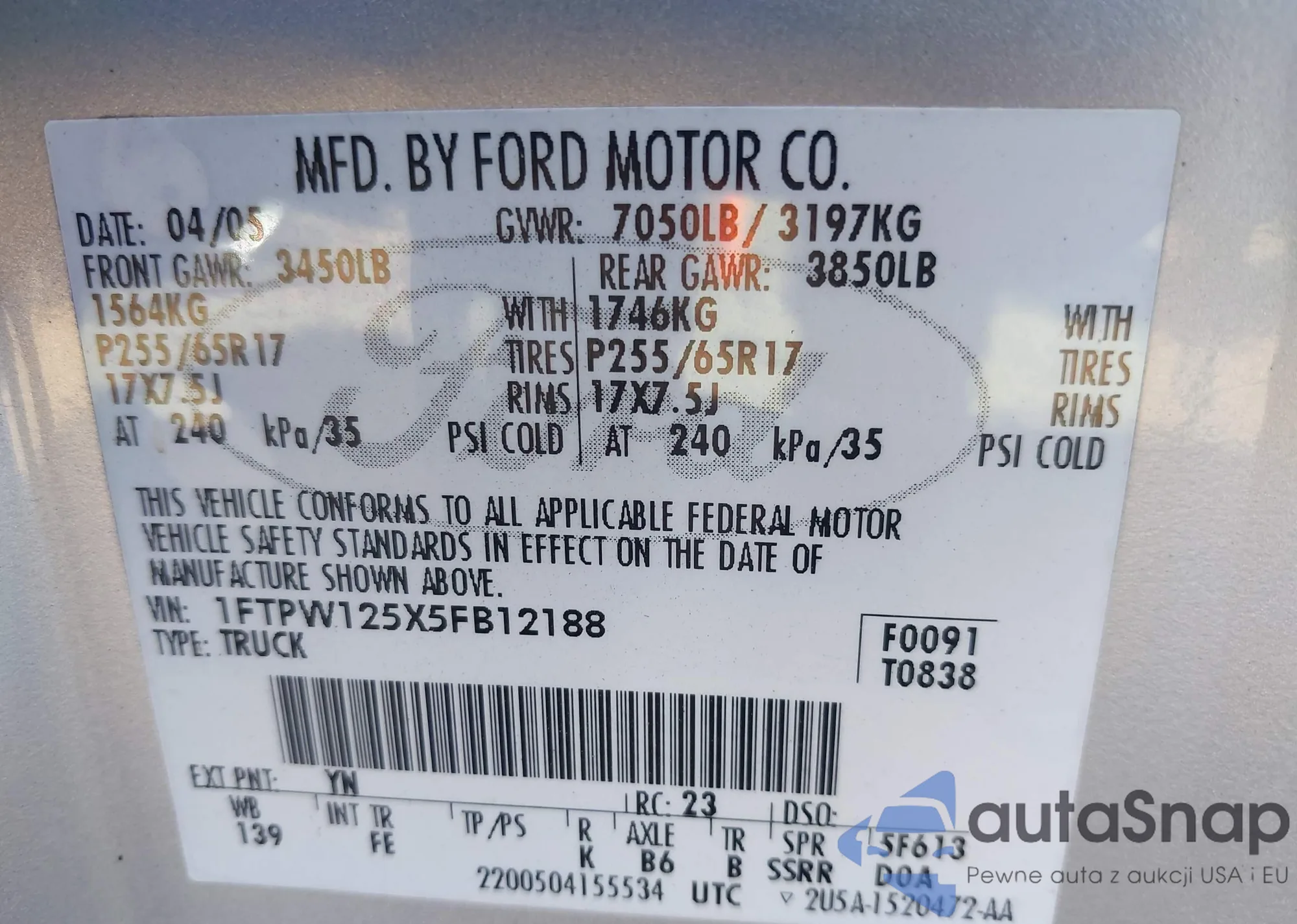 VIN: 1FTPW125X5FB12188