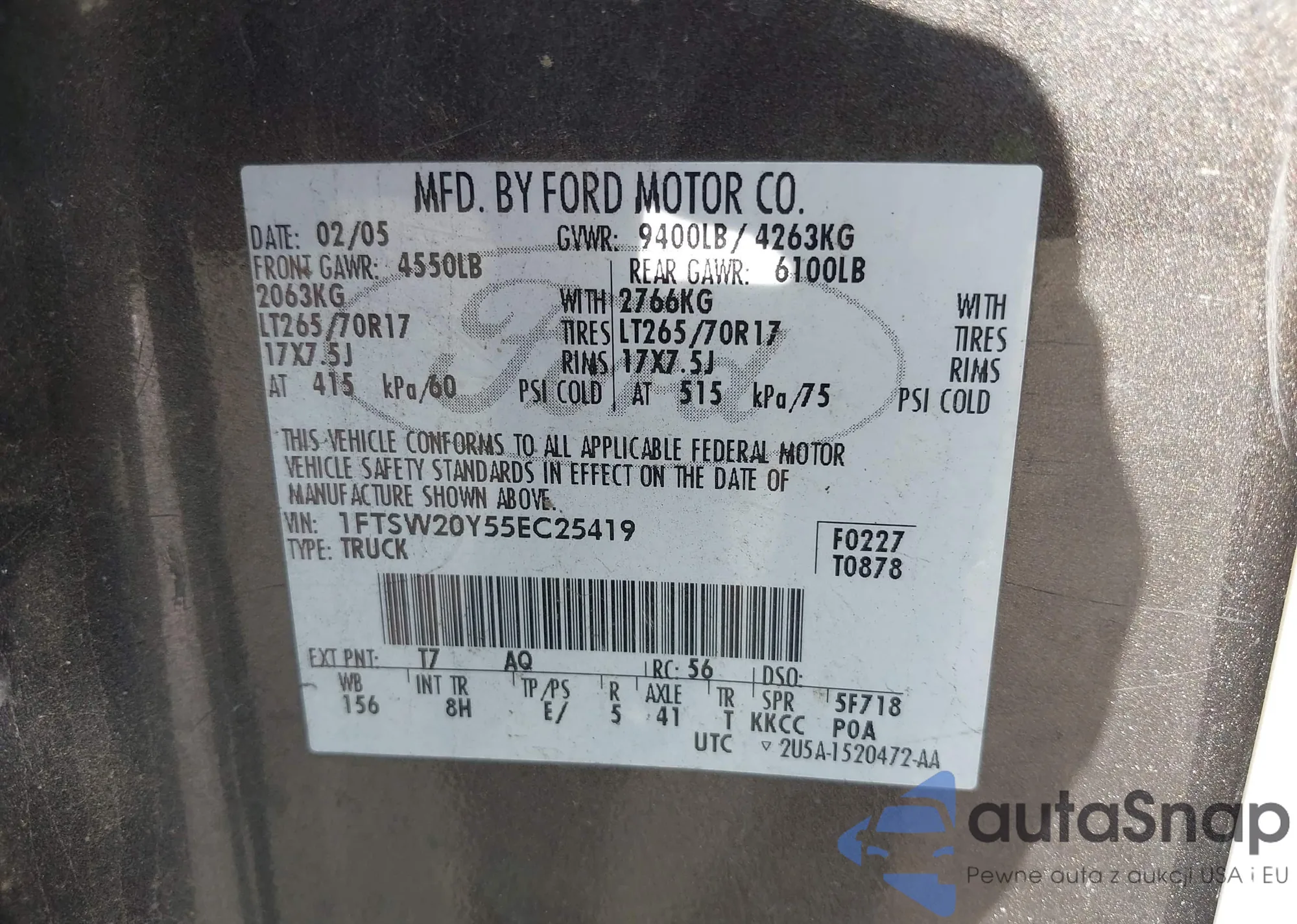 Samochód Ford F250 2005 (VIN 1FTSW20Y55EC25419) nie był wcześniej licytowany. Dokumenty są czyste, przebieg odpowiada lub jest niższy niż średnia rynku. Sprzedaje go firma ubezpieczeniowa – polecamy zakup. Dostawa do portu zajmie ok. 6–8 tygodni.