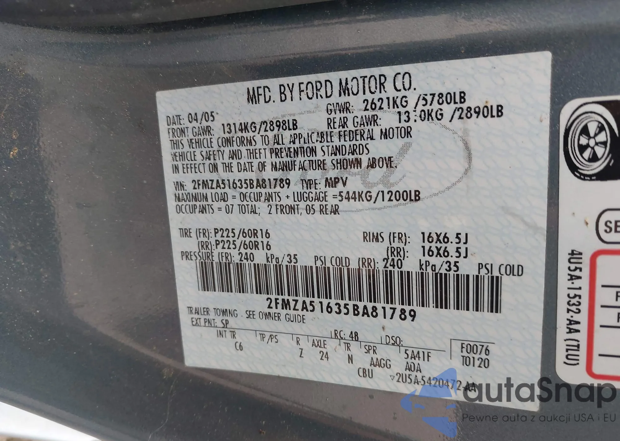 VIN: 2FMZA51635BA81789