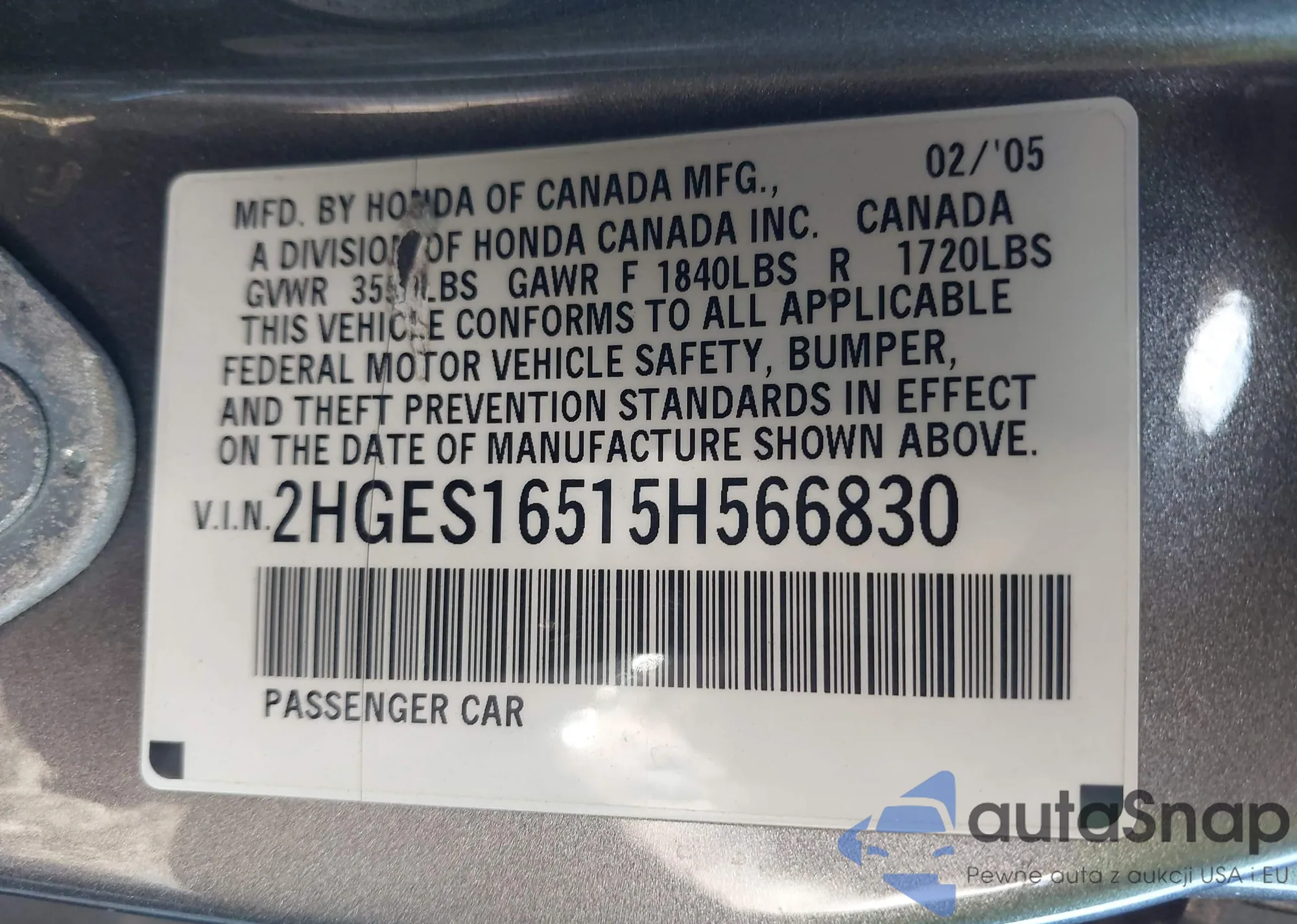 VIN: 2HGES16515H566830