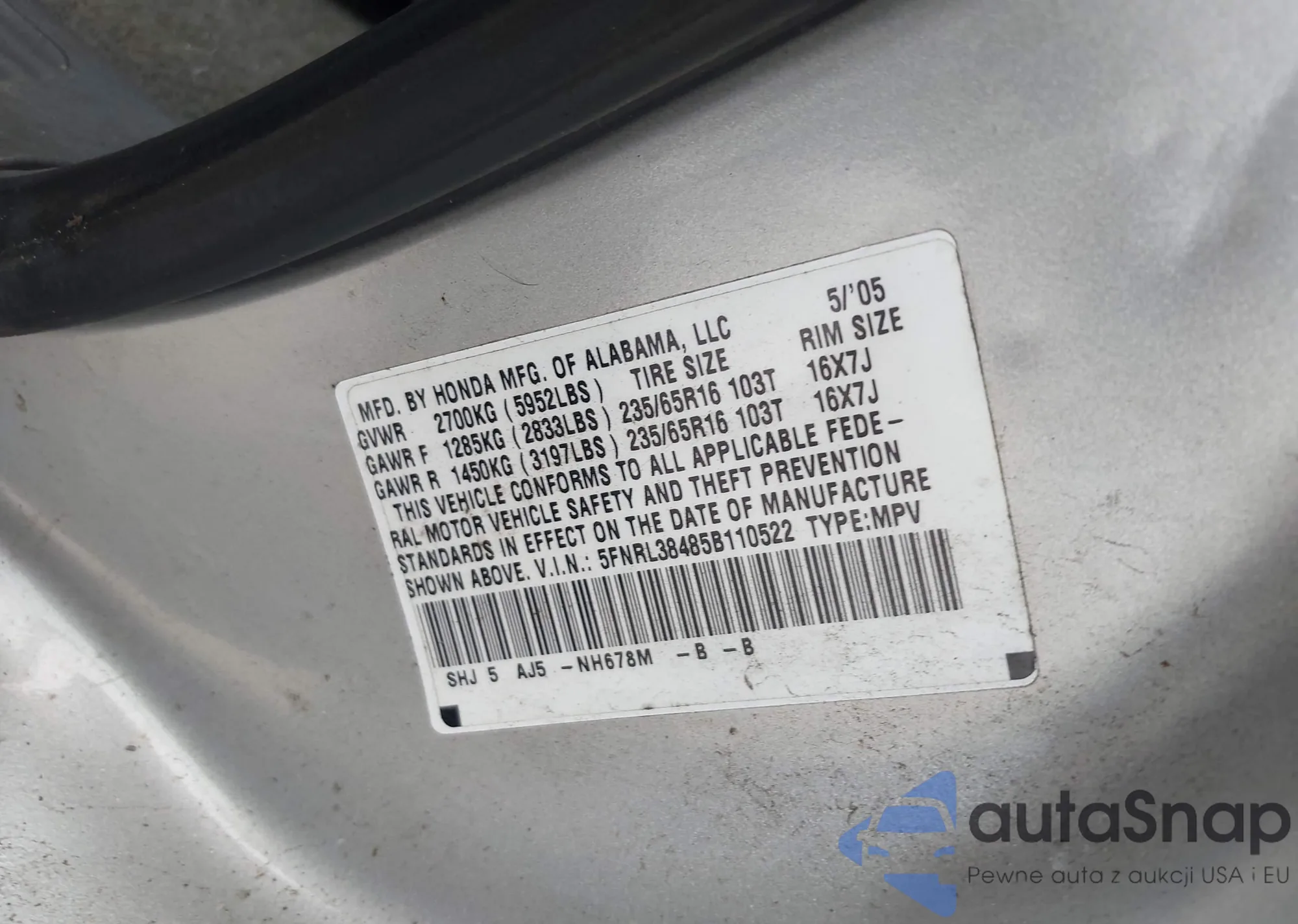 • VIN: 5FNRL38485B110522