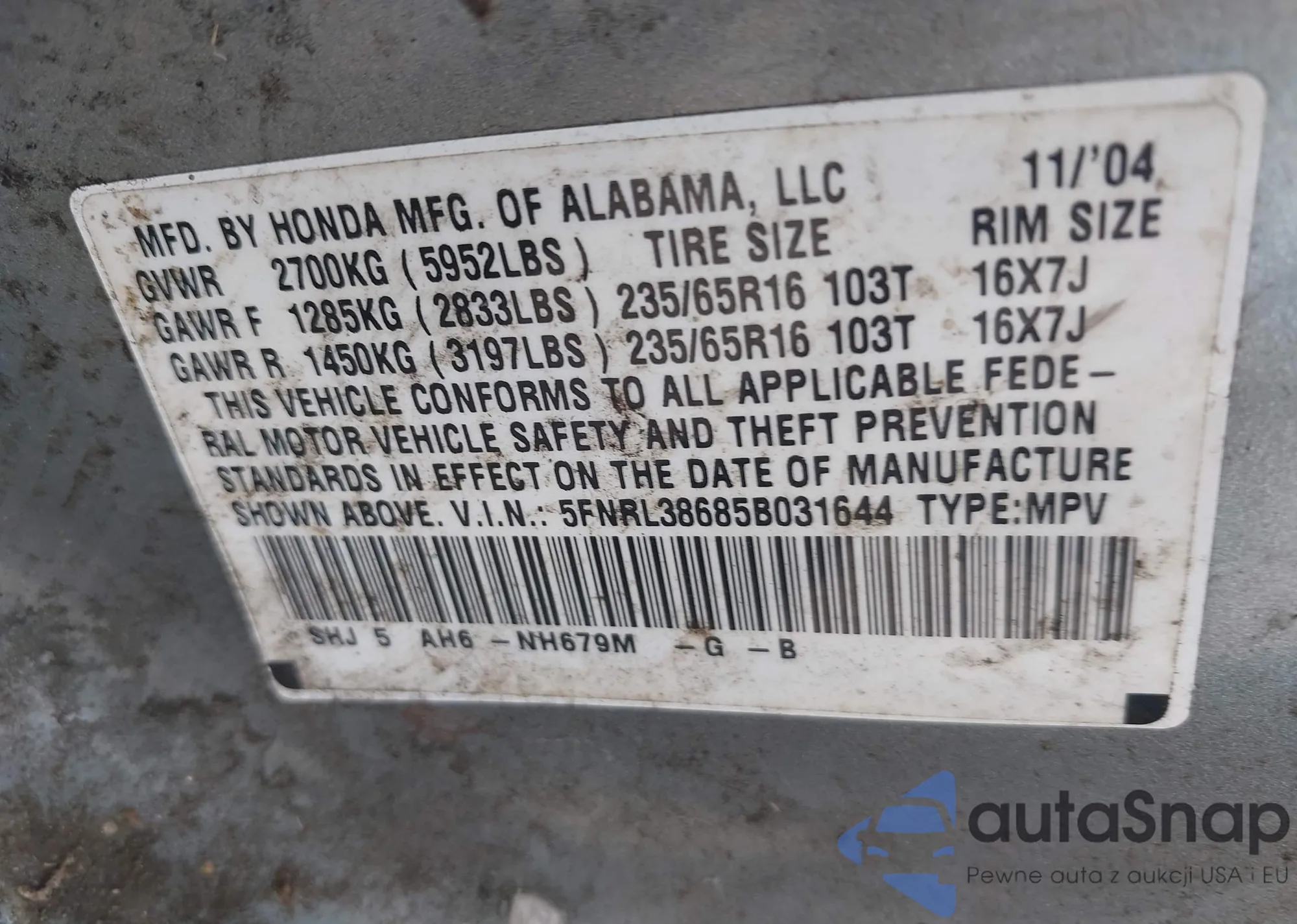 VIN: 5FNRL38685B031644