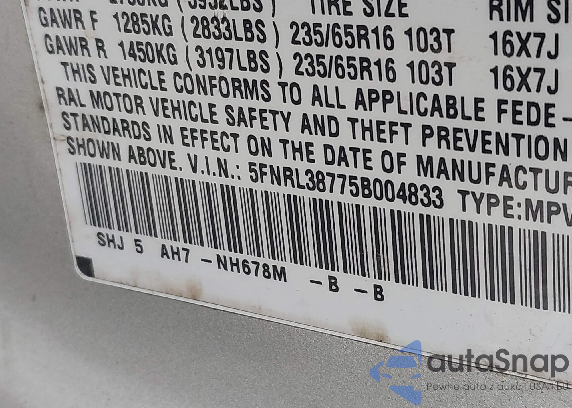 VIN: 5FNRL38775B004833