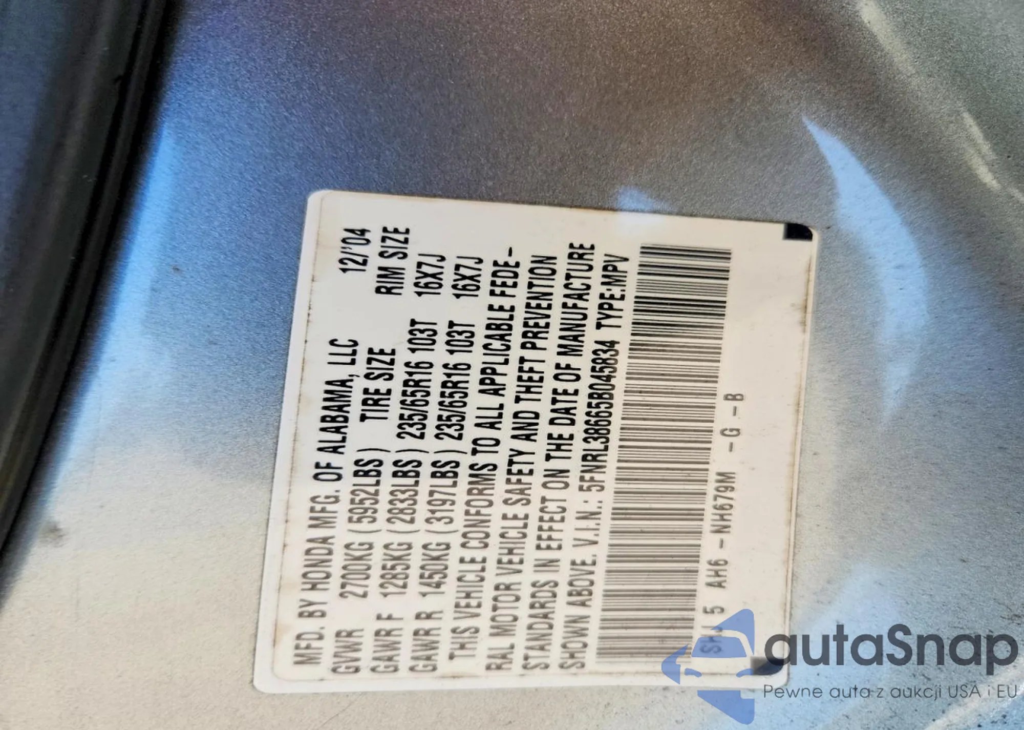 VIN: 5FNRL38665B045834