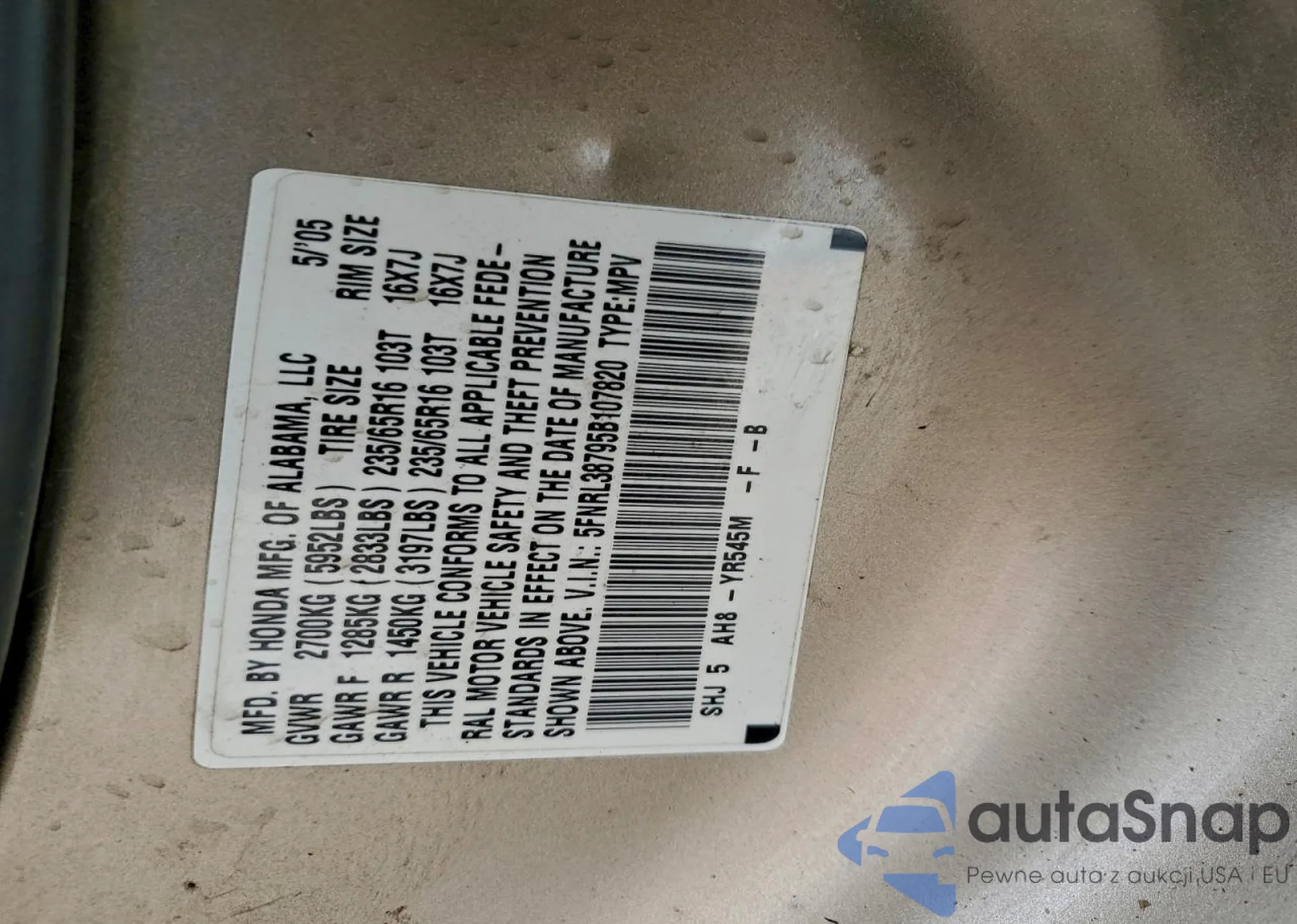 Samochód Honda Odyssey 2005 (VIN 5FNRL38795B107820) nie był wcześniej licytowany. Dokumenty są czyste, przebieg odpowiada lub jest niższy niż średnia rynku. Sprzedaje go firma ubezpieczeniowa – polecamy zakup. Dostawa do portu zajmie ok. 6–8 tygodni.