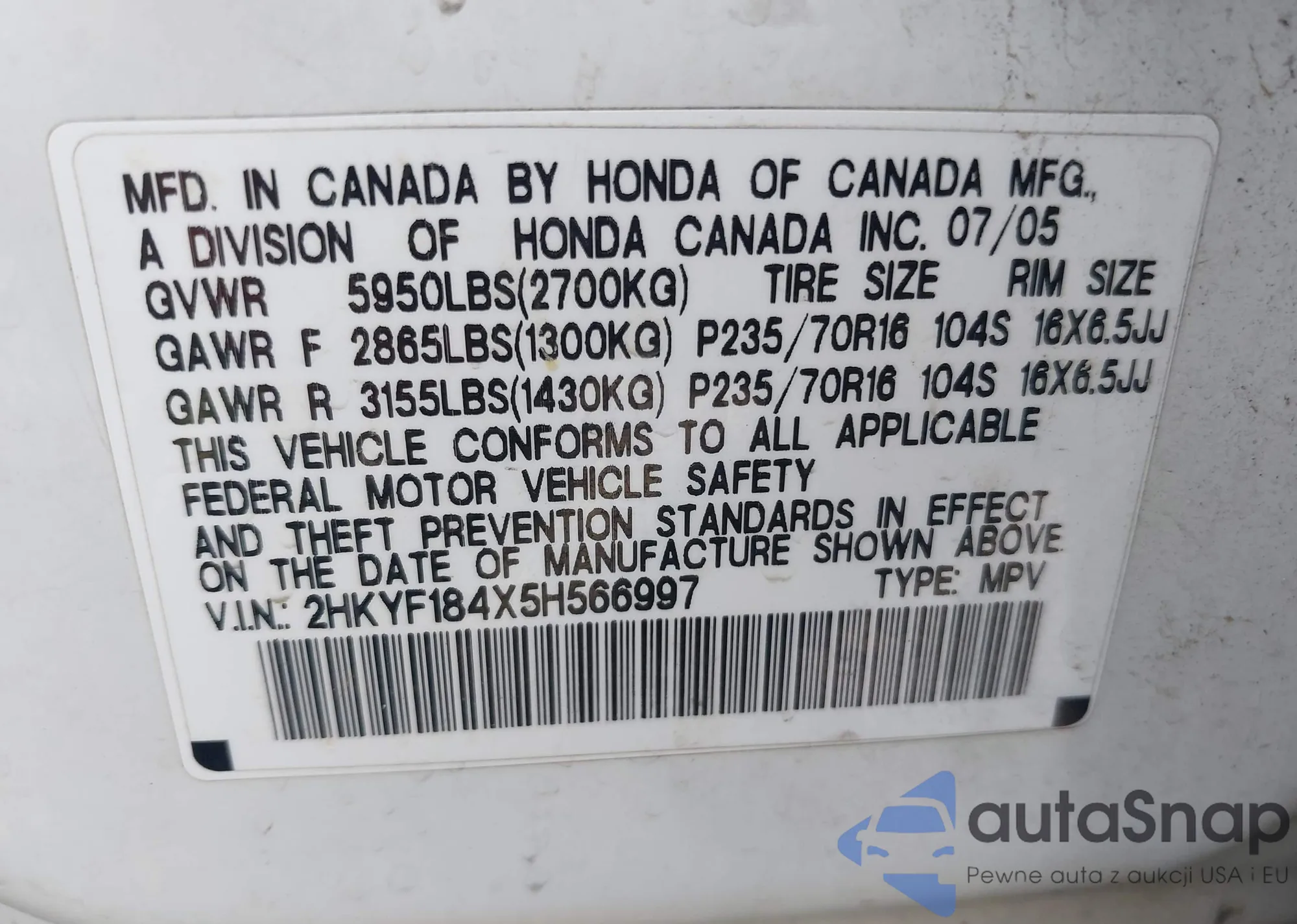 • VIN: 2HKYF1845H566997