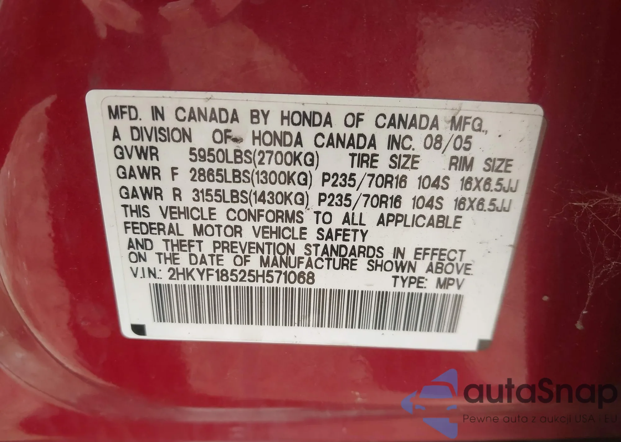 VIN: 2HKYF18525H571068