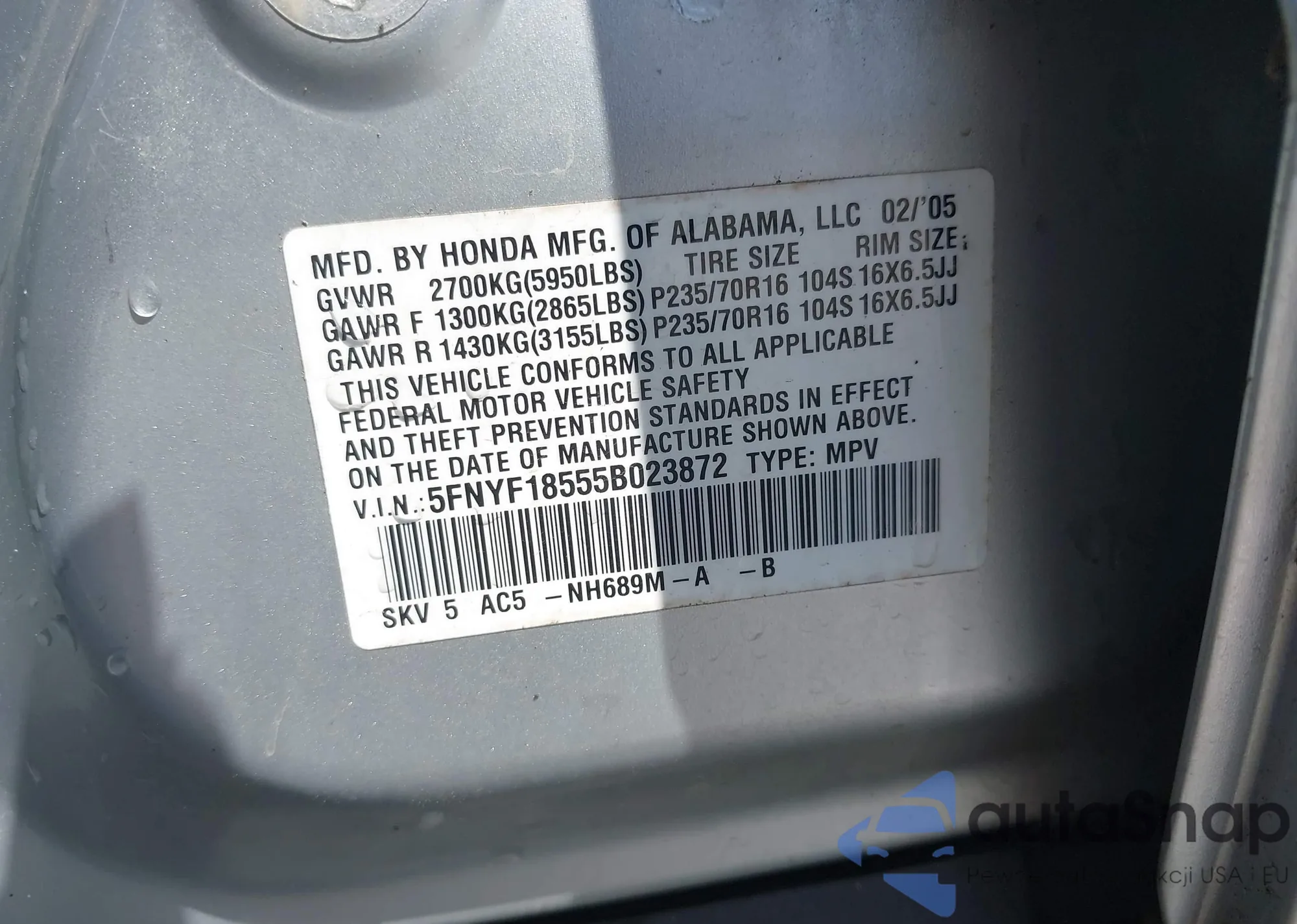 VIN: 5FNYF18555B023872