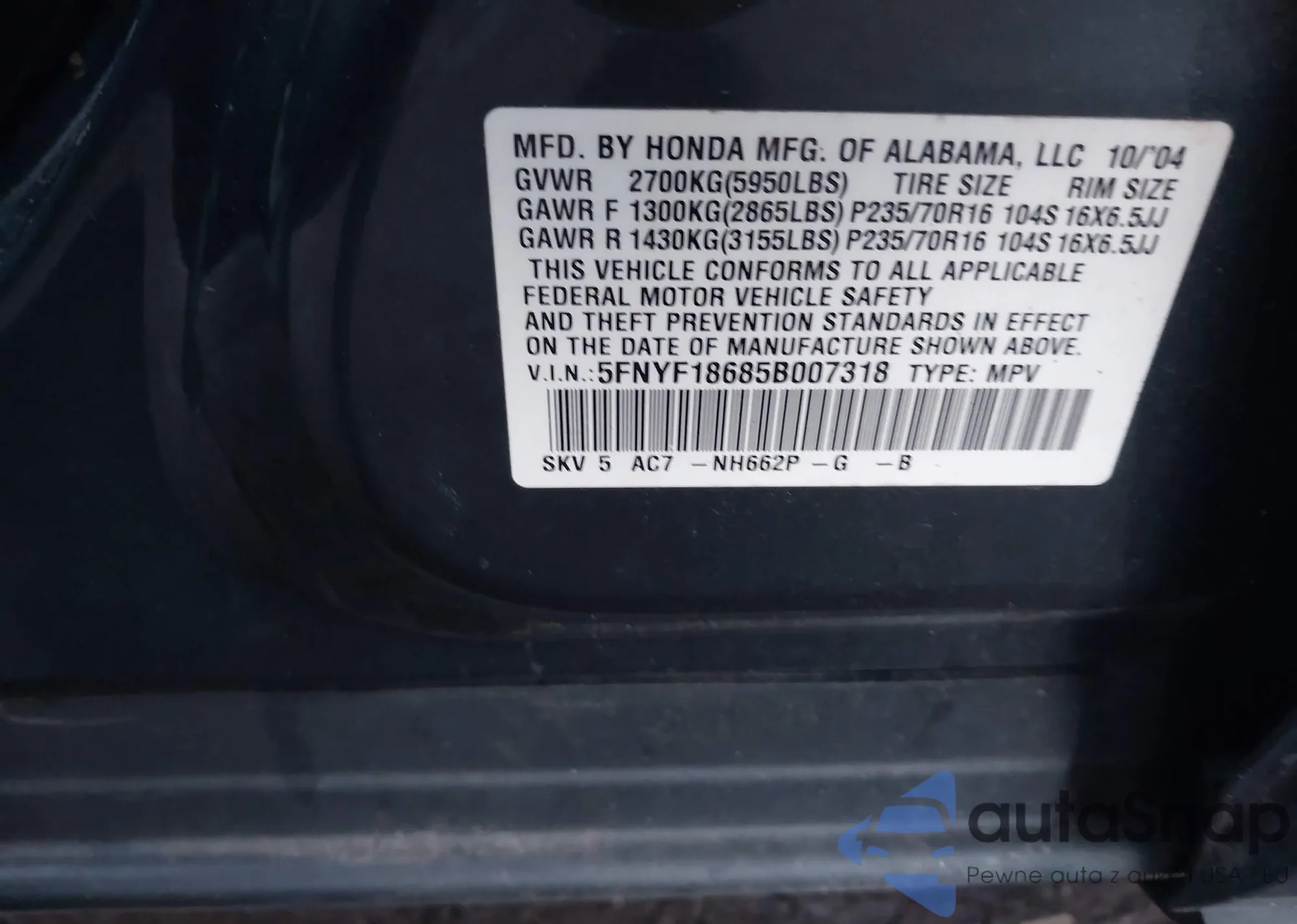 VIN: 5FNYF18685B007318