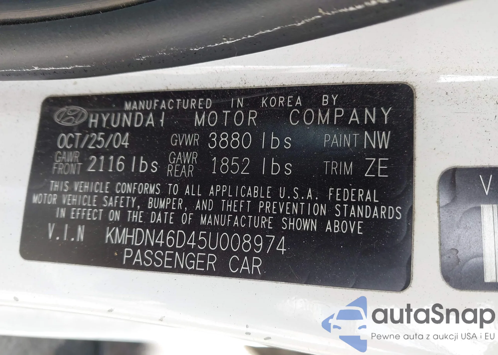 Samochód Hyundai Elantra 2005 (VIN KMHDN46D45U008974) ma dokumenty uniemożliwiające rejestrację. Mogą pojawić się trudności przy eksporcie i rejestracji. Skontaktuj się z ekspertami AutaSnap w celu znalezienia alternatywy.