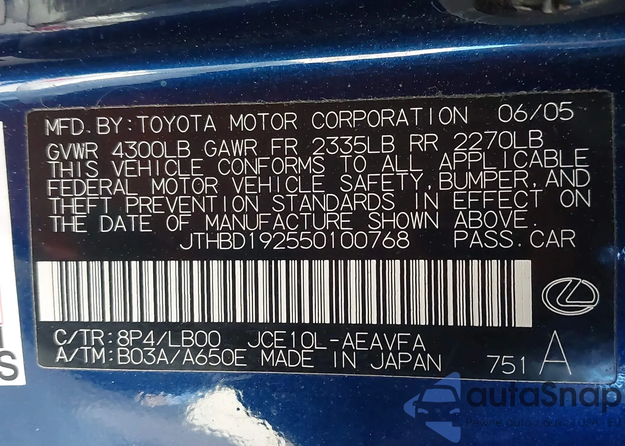VIN: JTHBD192550100768