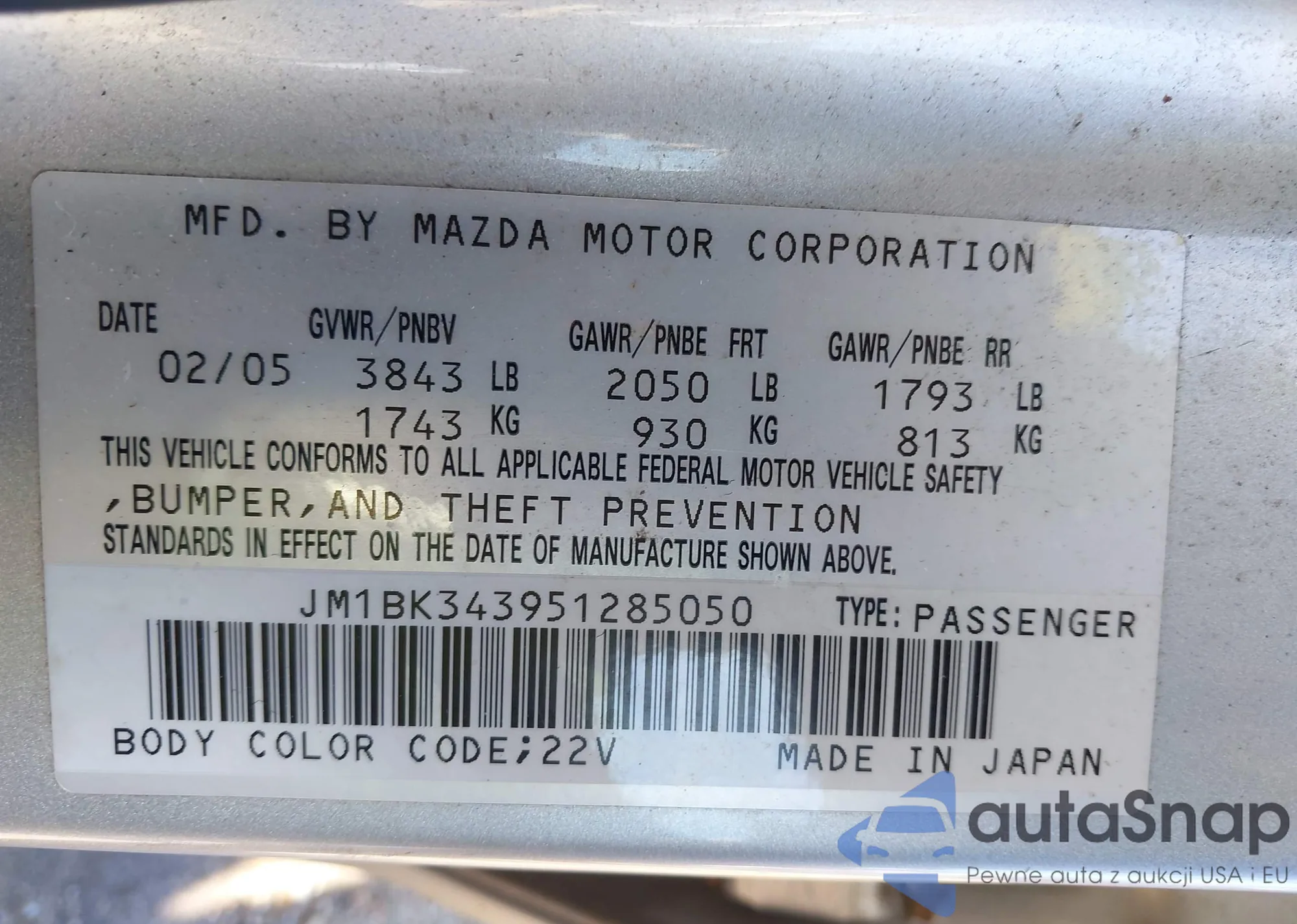 Samochód Mazda 3 2005 (VIN JM1BK343951285050) sprzedaje go niezweryfikowany sprzedawca. Zalecamy raport Carfax i potwierdzenie możliwości rejestracji pojazdu przed zakupem.