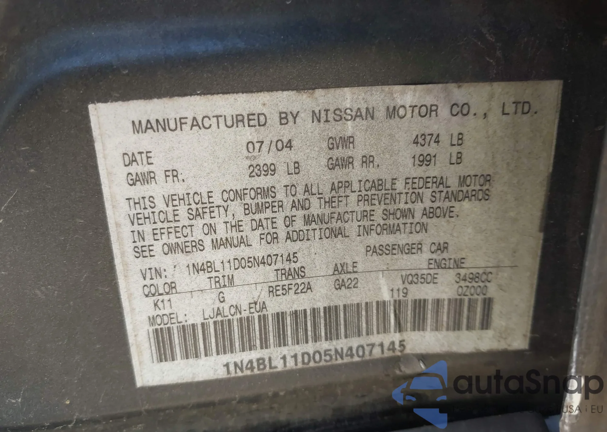 • VIN: 1N4BL11D05N407145