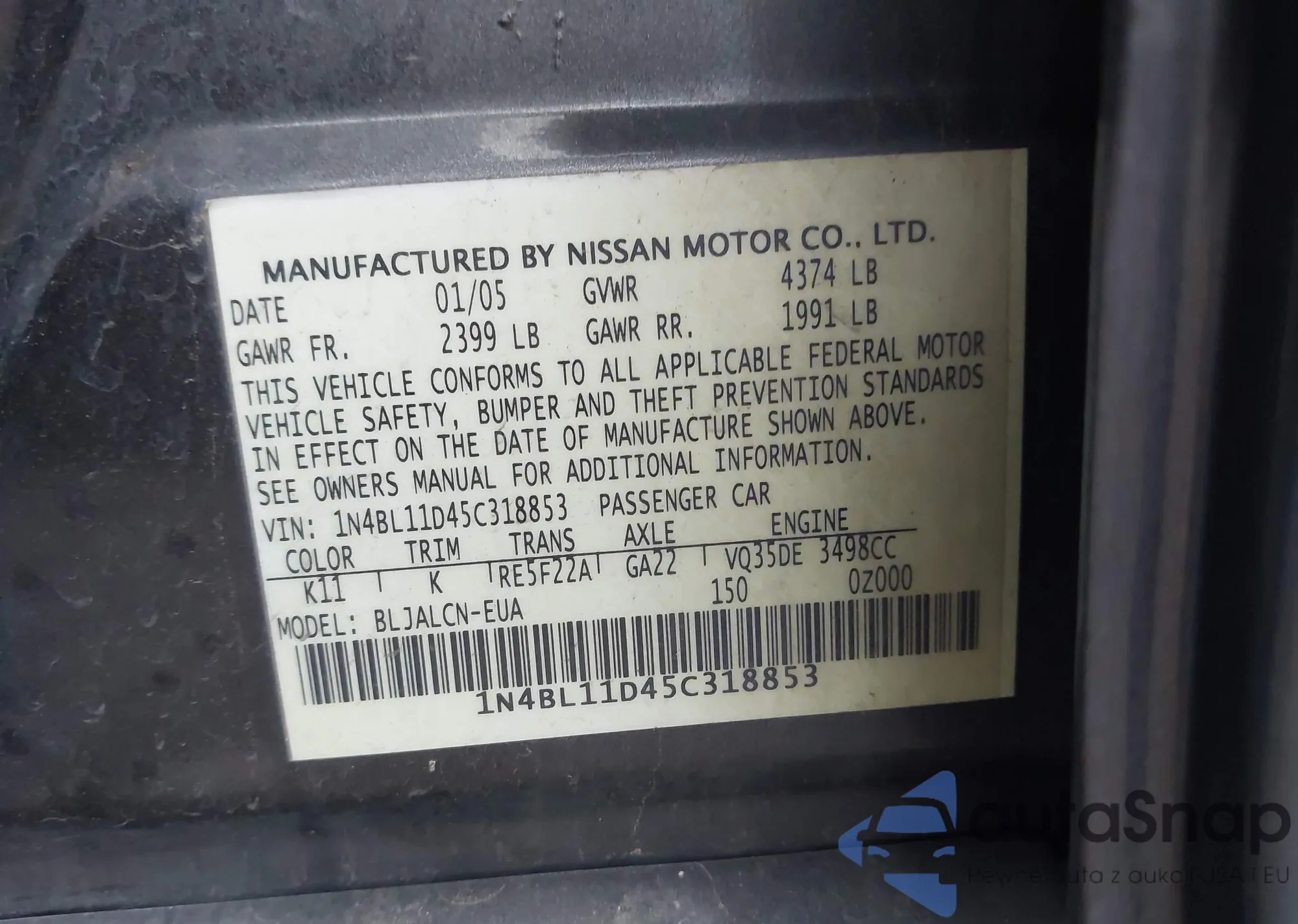 • VIN: 1N4BL11D45C318853
