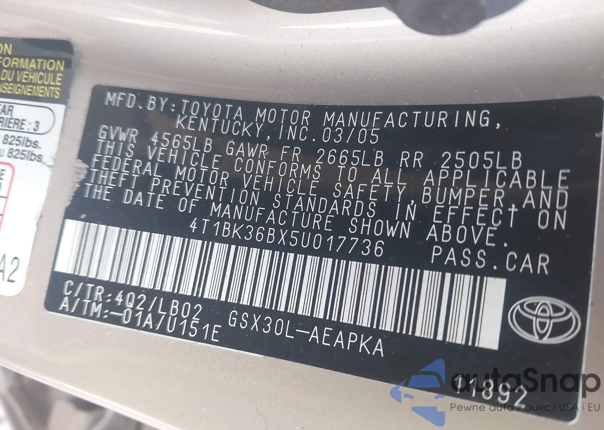 VIN: 4T1BK36BX5U017736