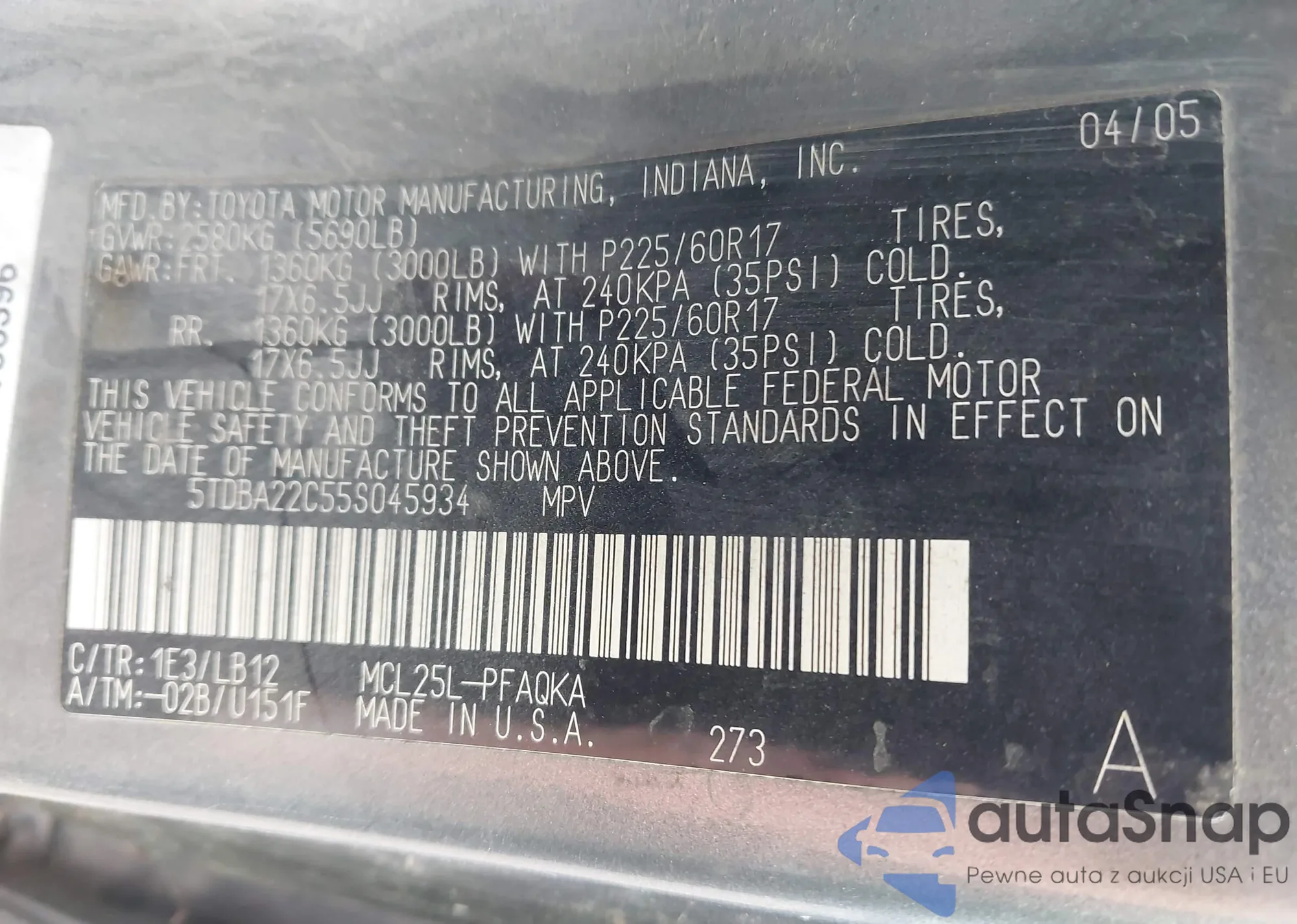 VIN: 5TDBA22C55S045934