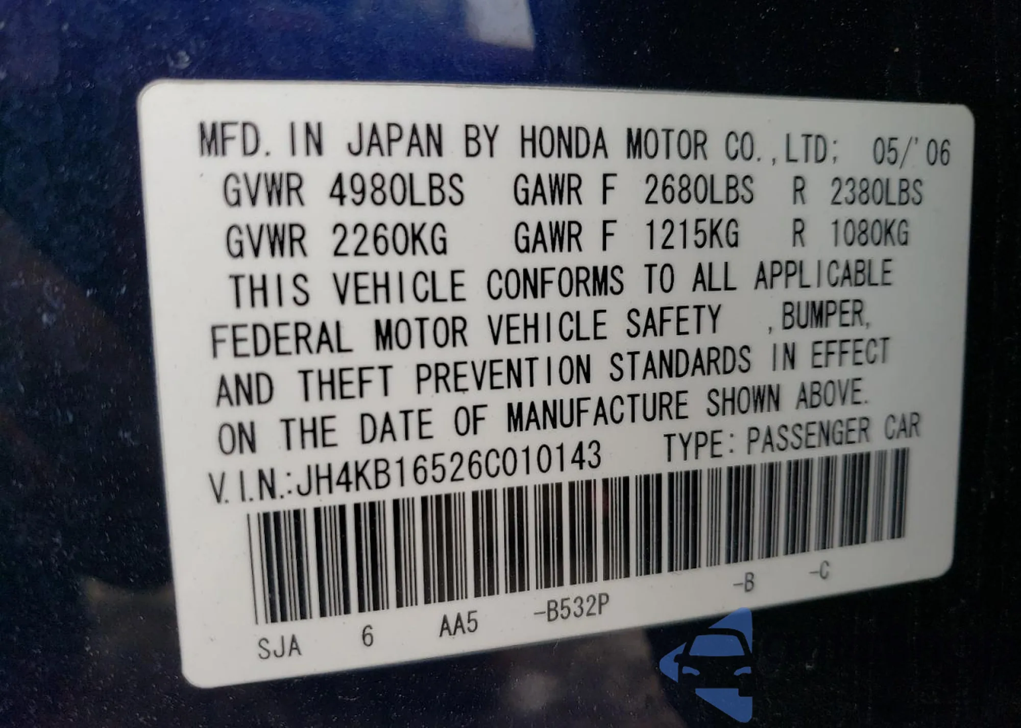 VIN: JH4KB16526C010143