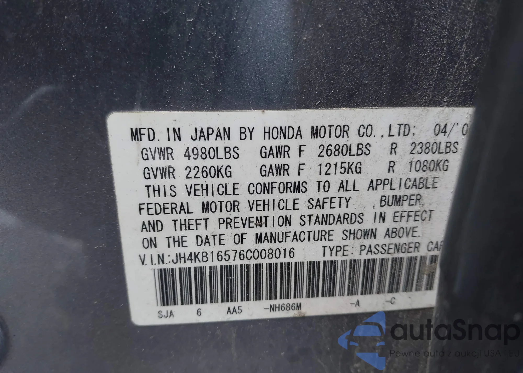 VIN: JH4KB16576C008016