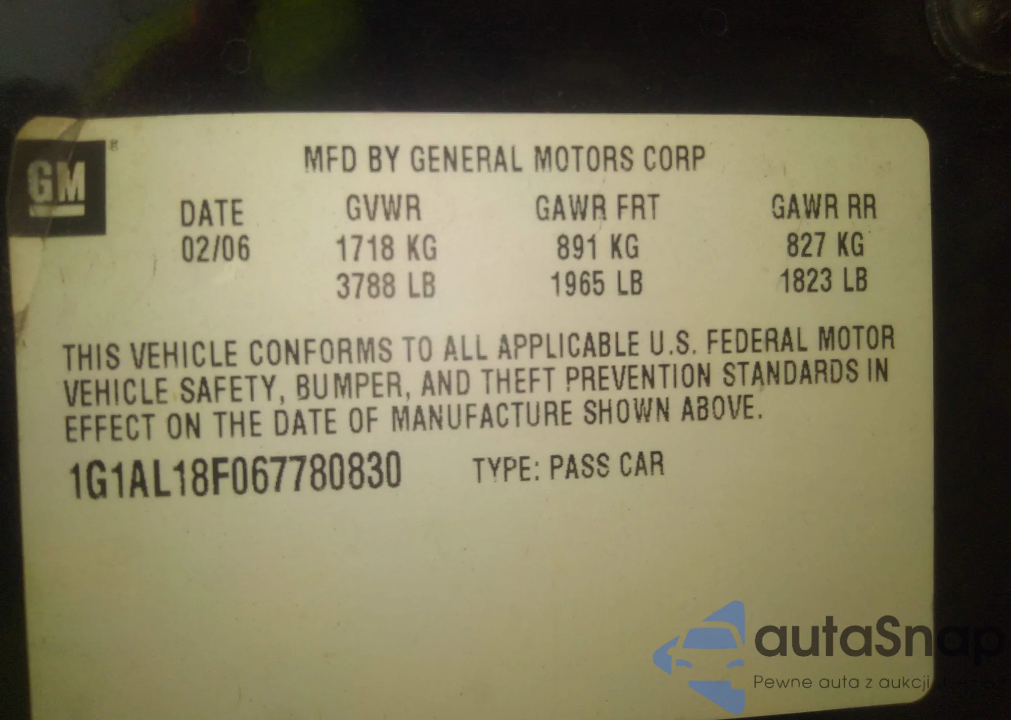 VIN: 1G1AL18F067780830