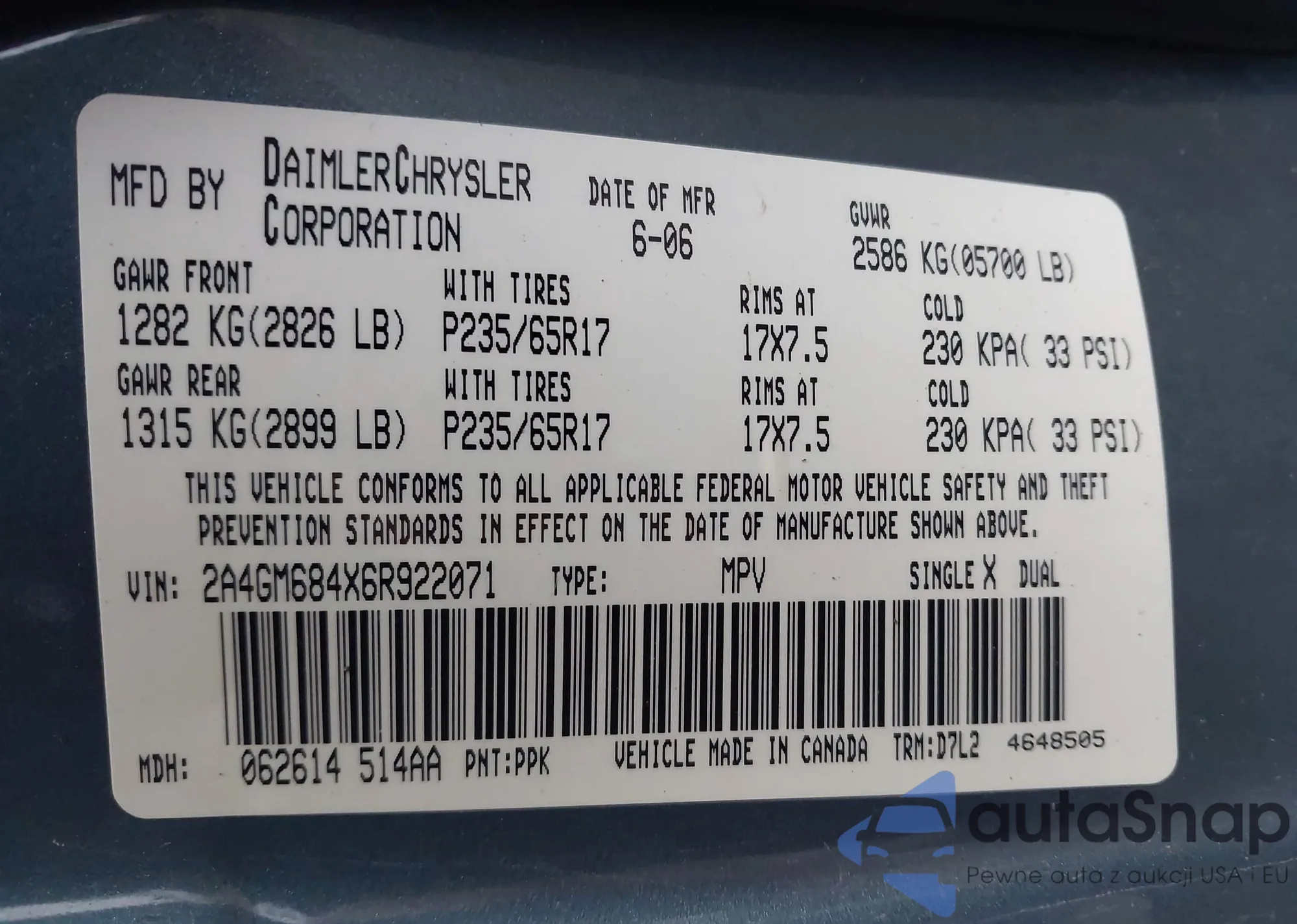 VIN: 2A4GM684X6R922071