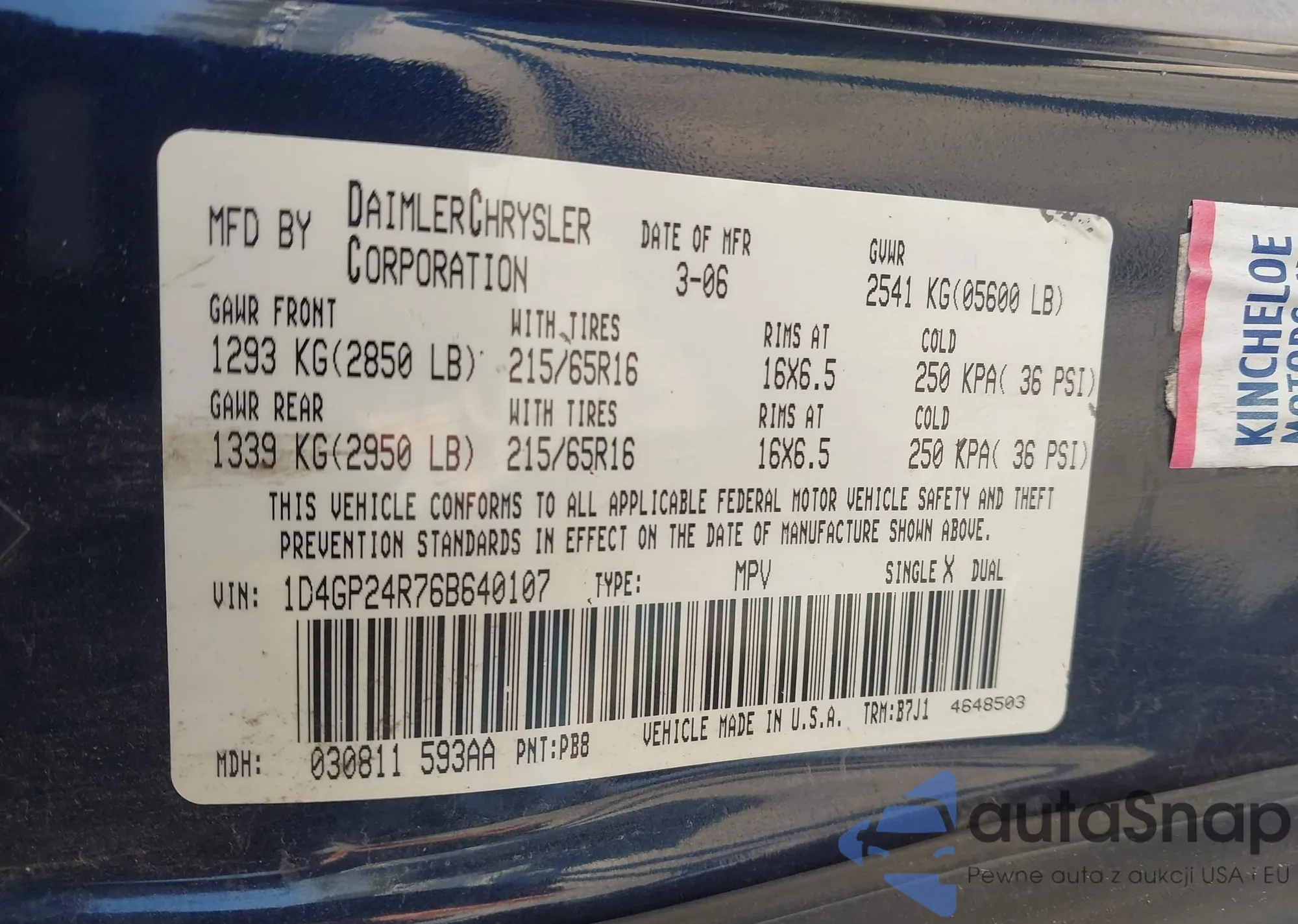Samochód Dodge Caravan 2006 (VIN 1D4GP24R76B640107) nie był wcześniej licytowany. Dokumenty są czyste, przebieg odpowiada lub jest niższy niż średnia rynku. Sprzedaje go firma ubezpieczeniowa – polecamy zakup. Dostawa do portu zajmie ok. 6–8 tygodni.