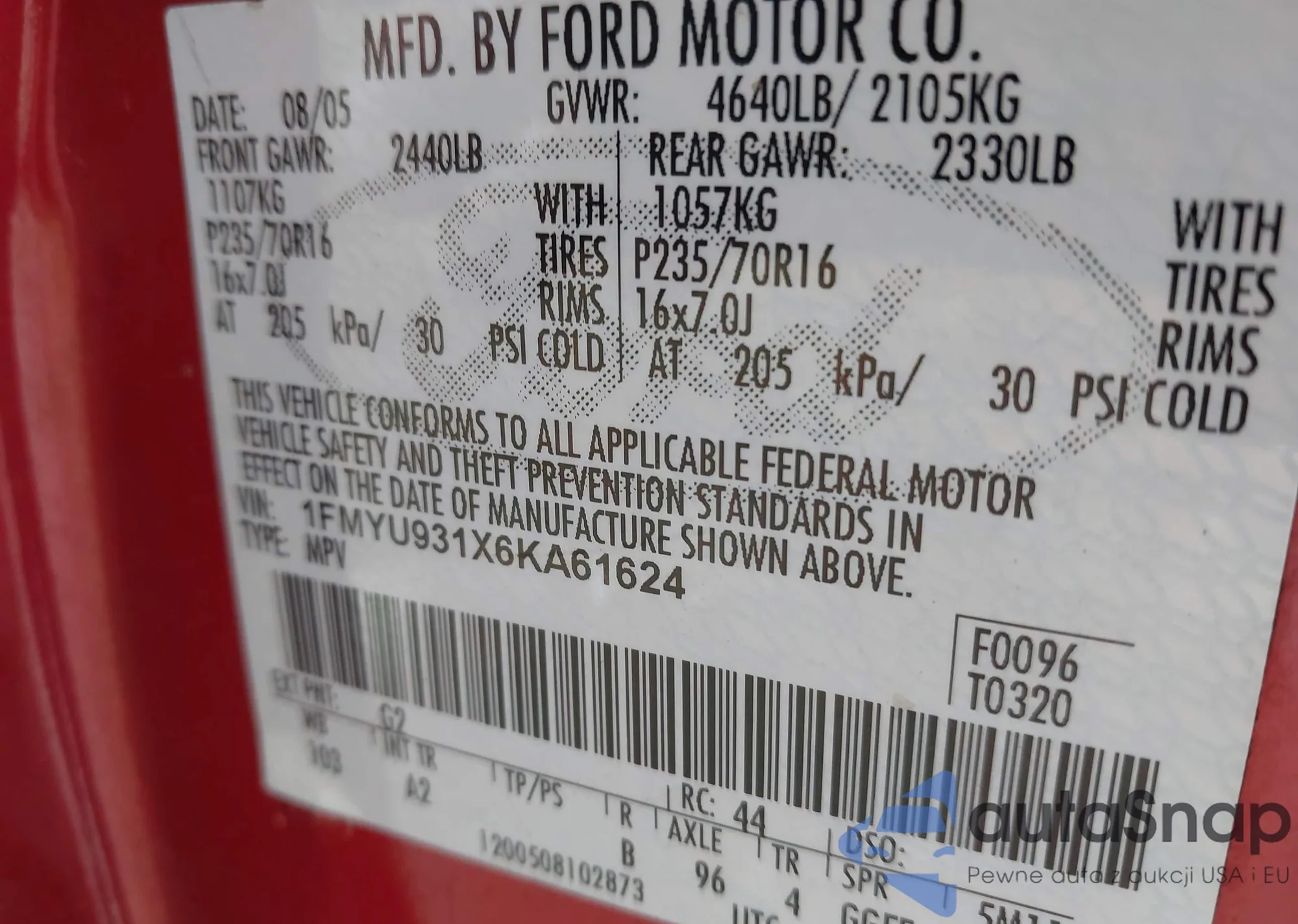VIN: 1FMYU931X6KA61624