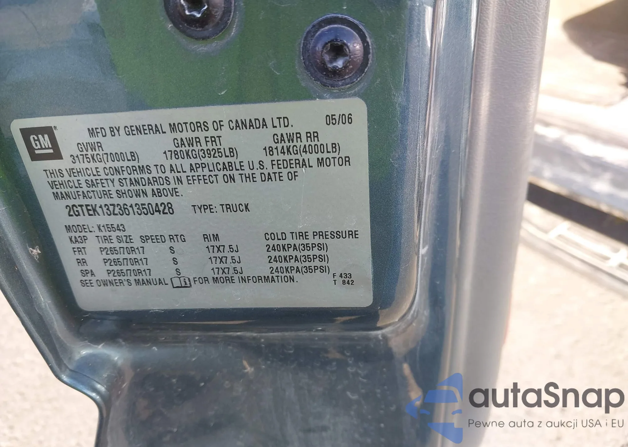 Samochód GMC Sierra 2006 (VIN 2GTEK13Z361350428) ma dokumenty uniemożliwiające rejestrację. Mogą pojawić się trudności przy eksporcie i rejestracji. Skontaktuj się z ekspertami AutaSnap w celu znalezienia alternatywy.