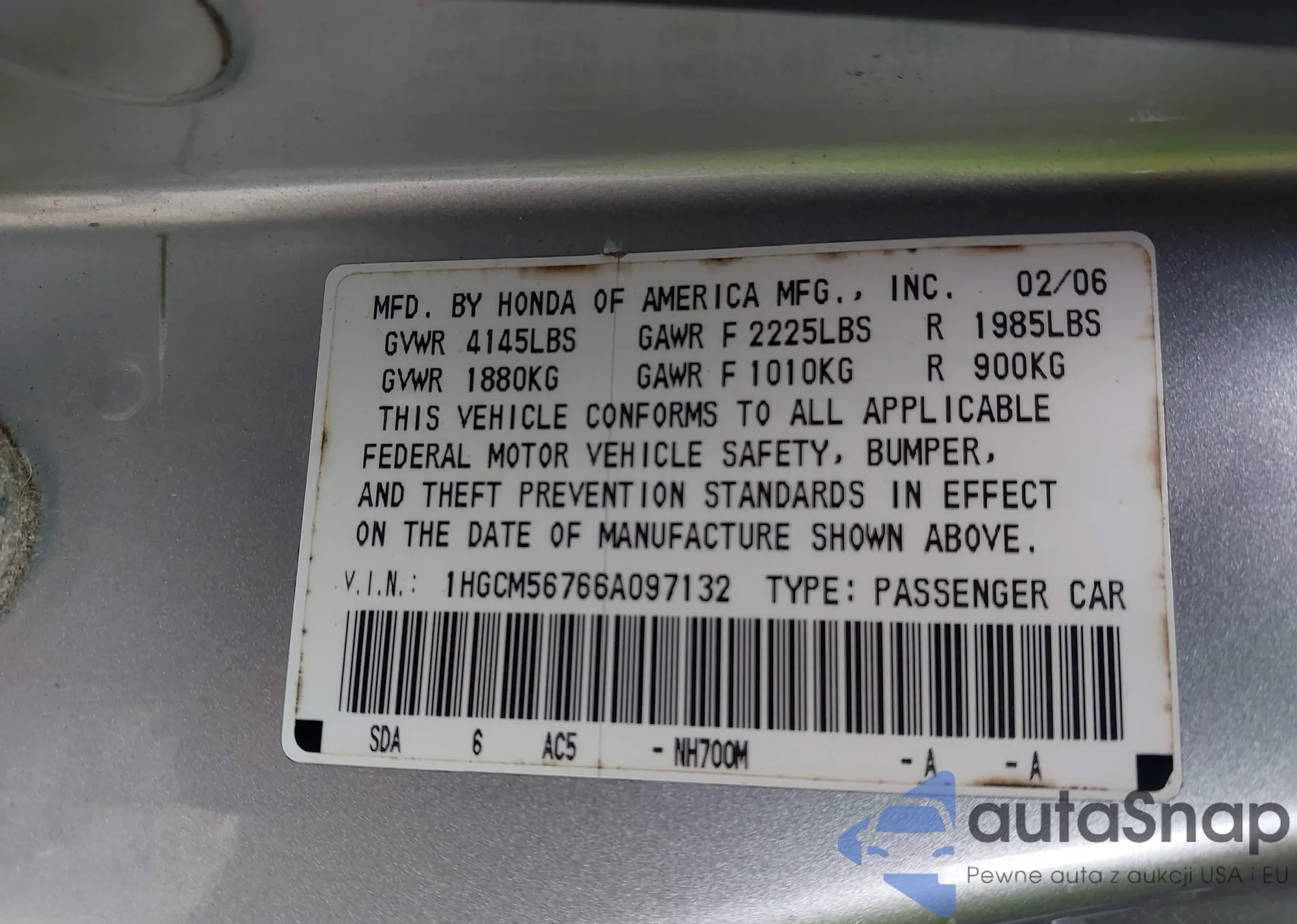 VIN: 1HGCM56766A097132