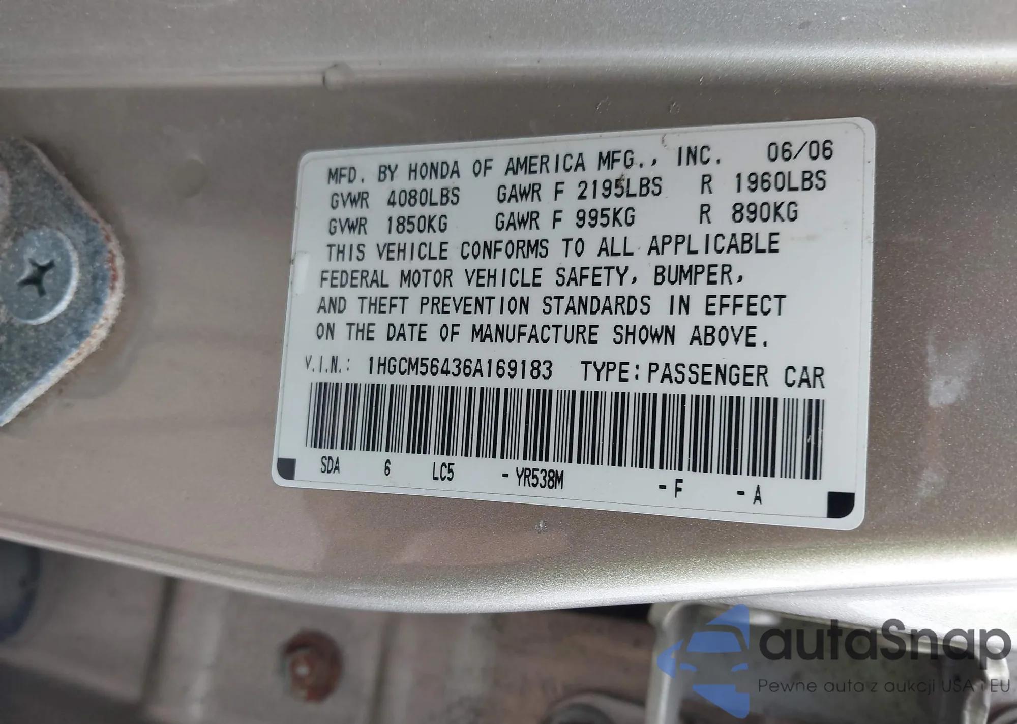 VIN: 1HGCM56436A169183