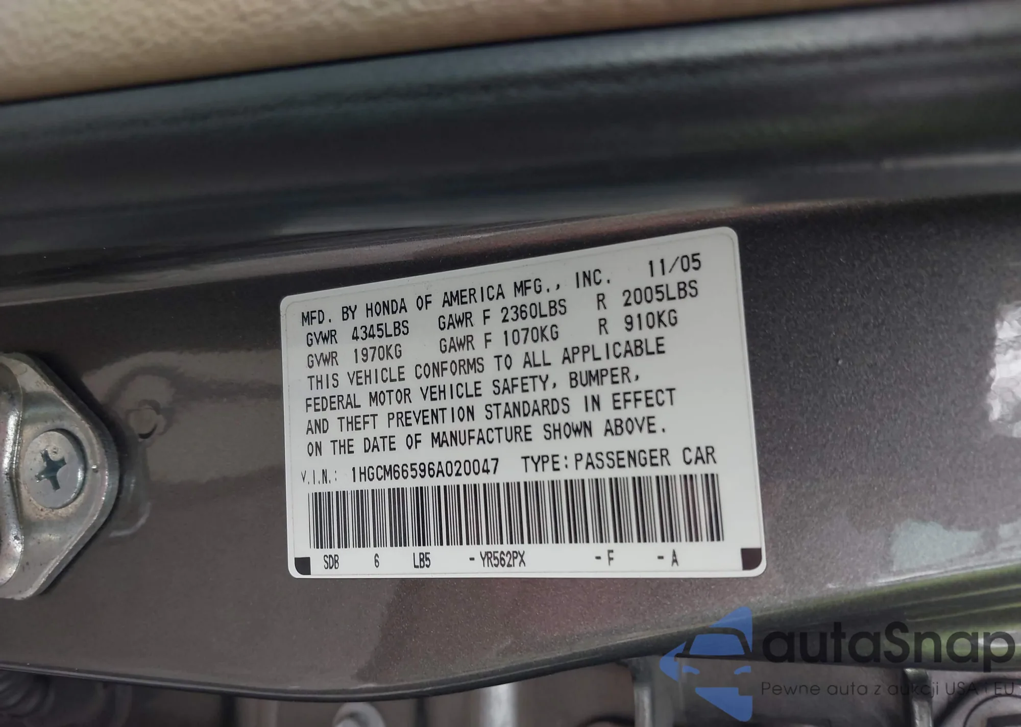Samochód Honda Accord 2006 (VIN 1HGCM66596A020047) nie był wcześniej licytowany. Dokumenty są czyste, przebieg odpowiada lub jest niższy niż średnia rynku. Sprzedaje go firma ubezpieczeniowa – polecamy zakup. Dostawa do portu zajmie ok. 6–8 tygodni.