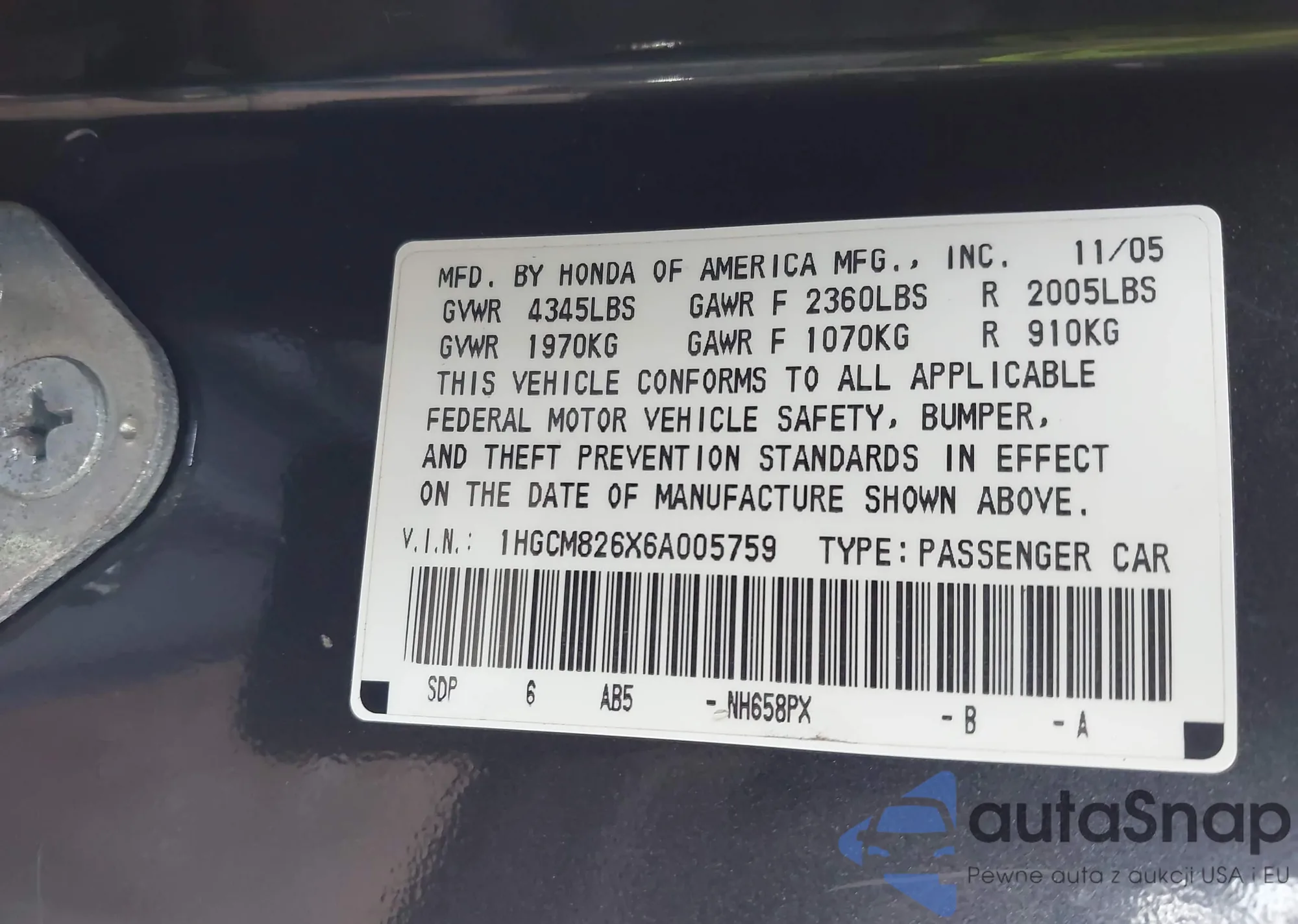 Samochód Honda Accord 2006 (VIN 1HGCM826X6A005759) nie był wcześniej licytowany. Dokumenty są czyste, przebieg odpowiada lub jest niższy niż średnia rynku. Sprzedaje go firma ubezpieczeniowa – polecamy zakup. Dostawa do portu zajmie ok. 6–8 tygodni.