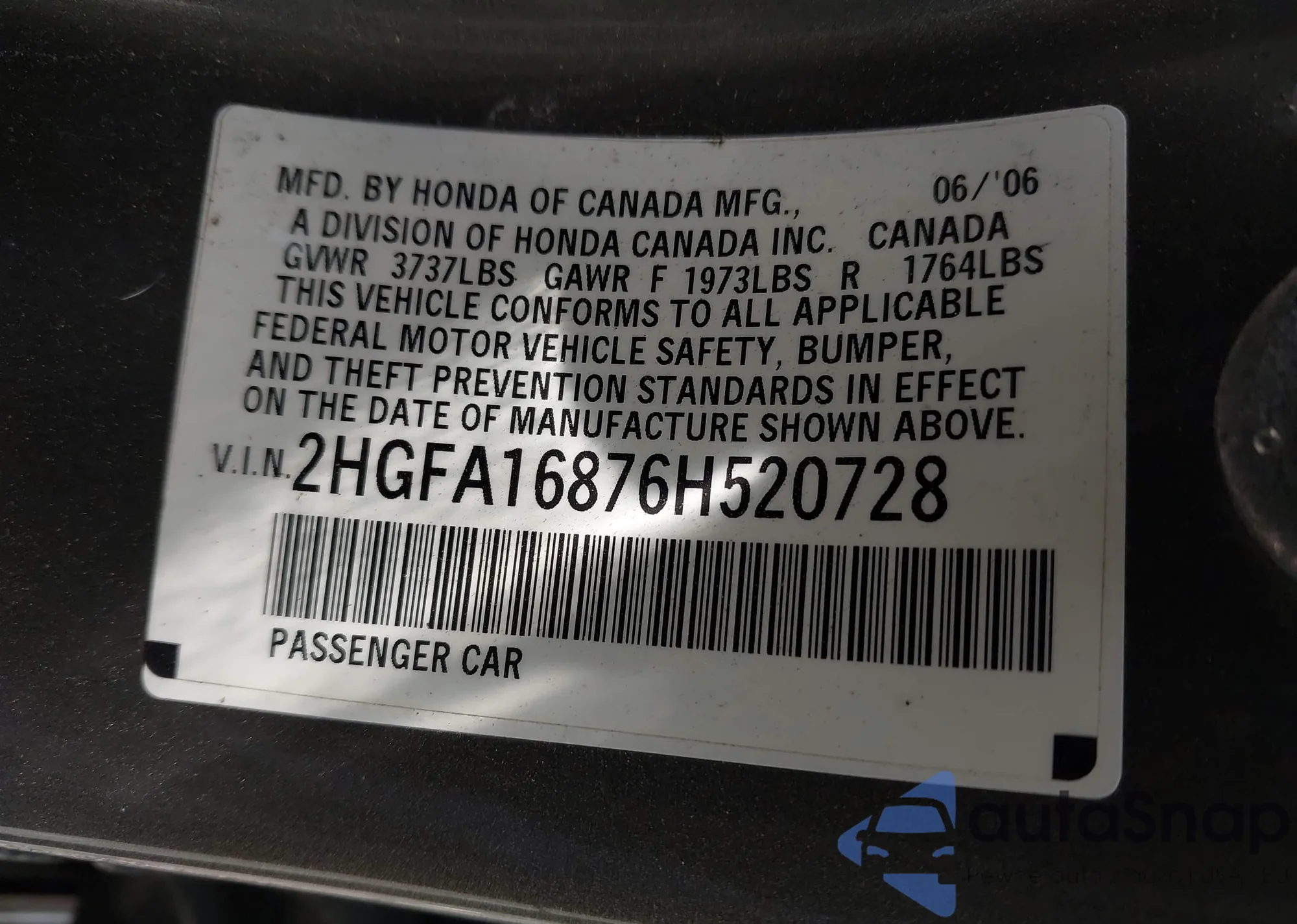 VIN: 2HGFA16876H520728