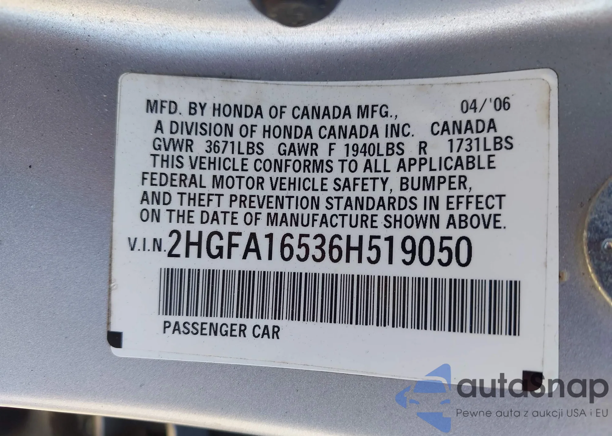 VIN: 2HGFA16536H519050