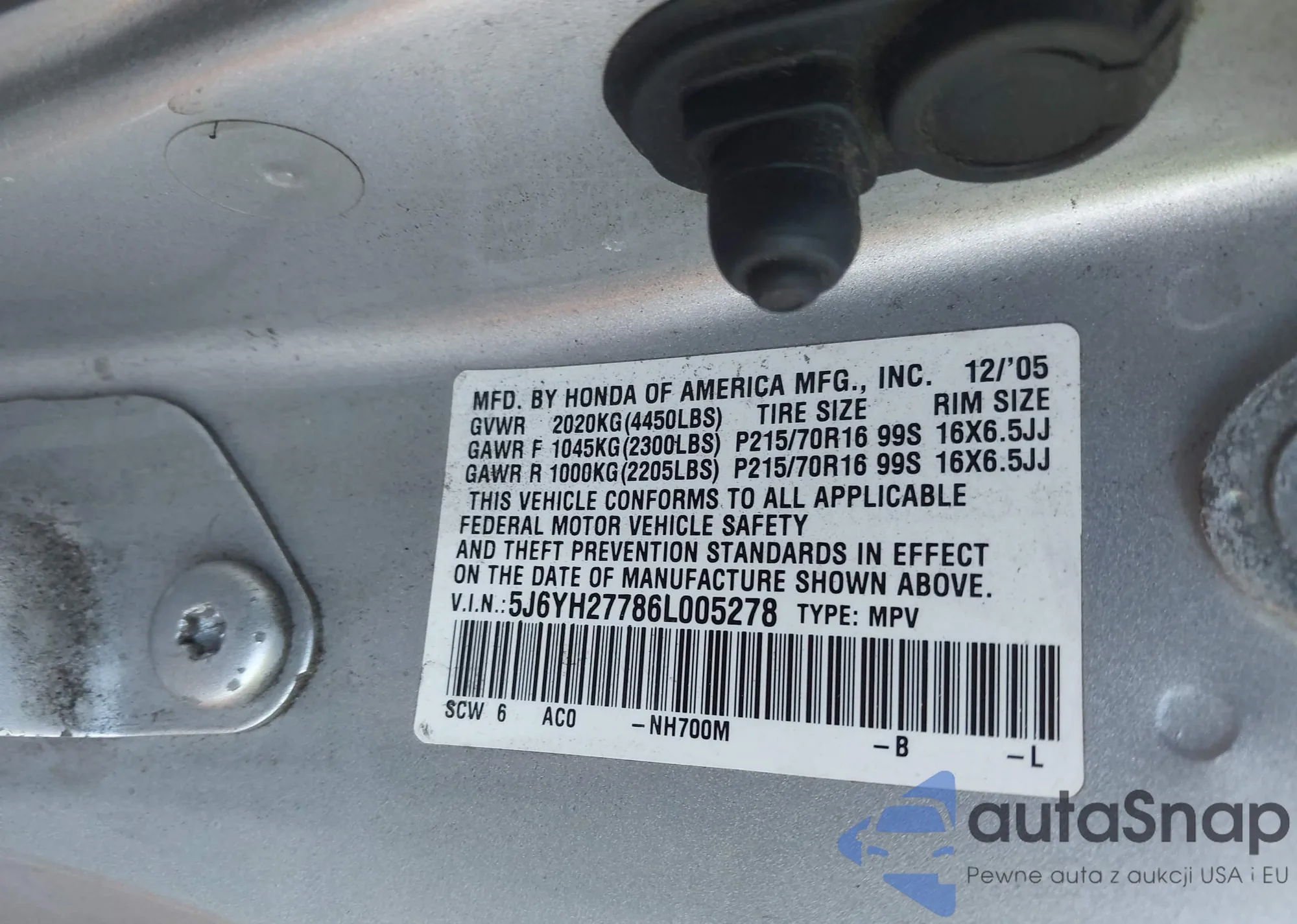 VIN: 5J6YH27786L005278